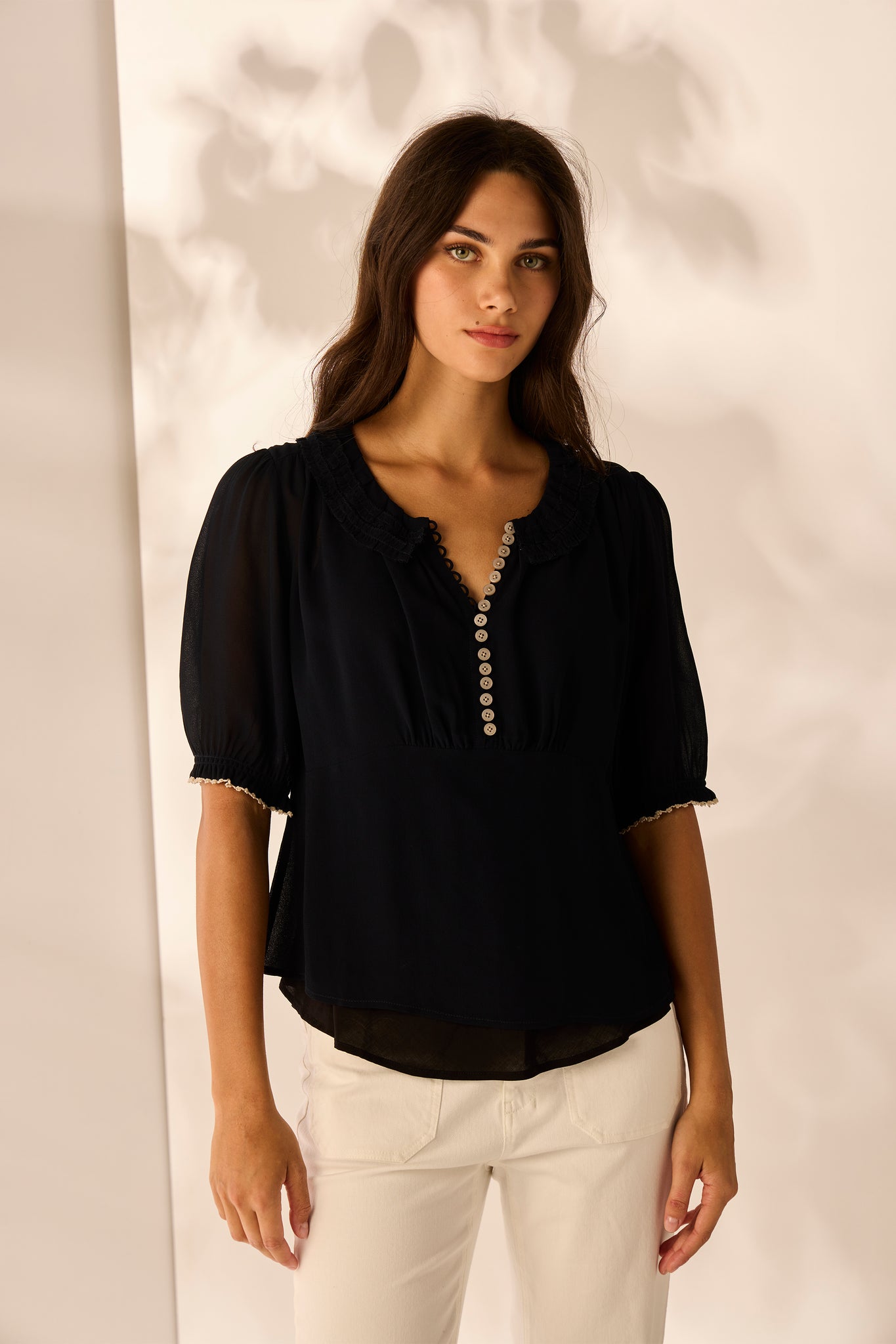 Step in to summer elegance with the Lottie Top, featuring a soft ruffle detailing on the collar and delicate buttons and loop neck opening add a romantic touch. Finished with sleeves adorned in shirred ruffle cuffs, this blouse is ideal for elevating an outfit.