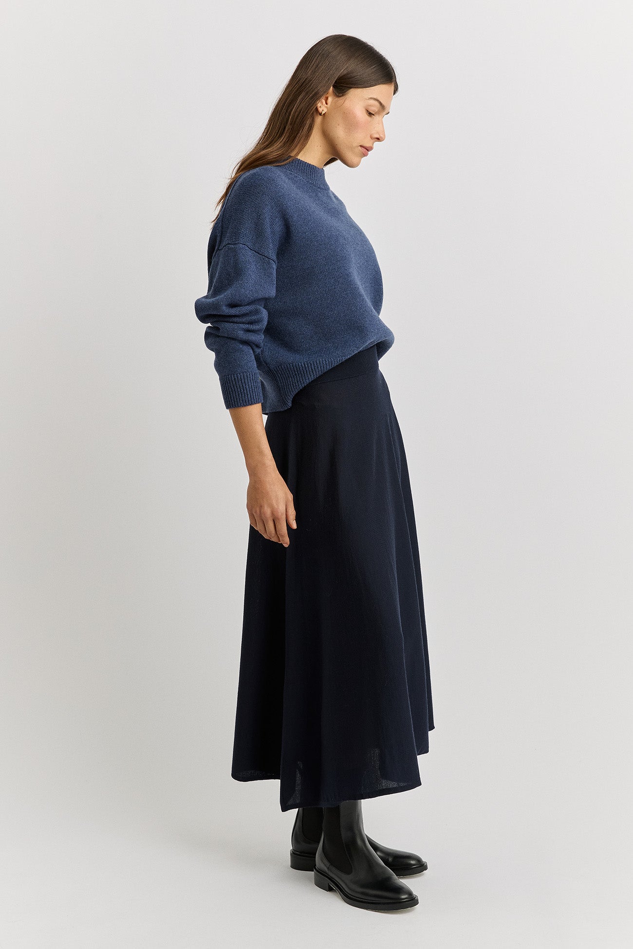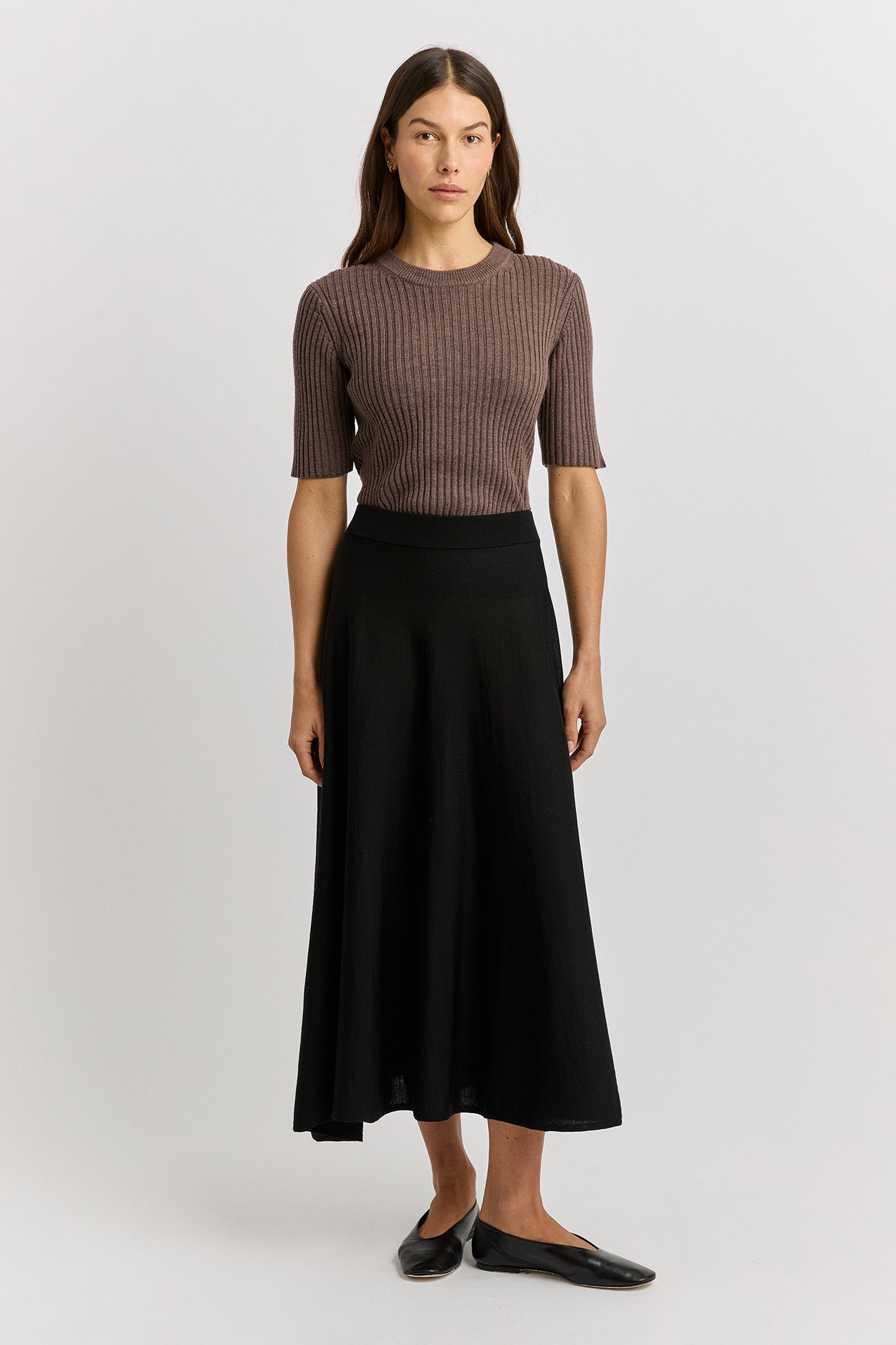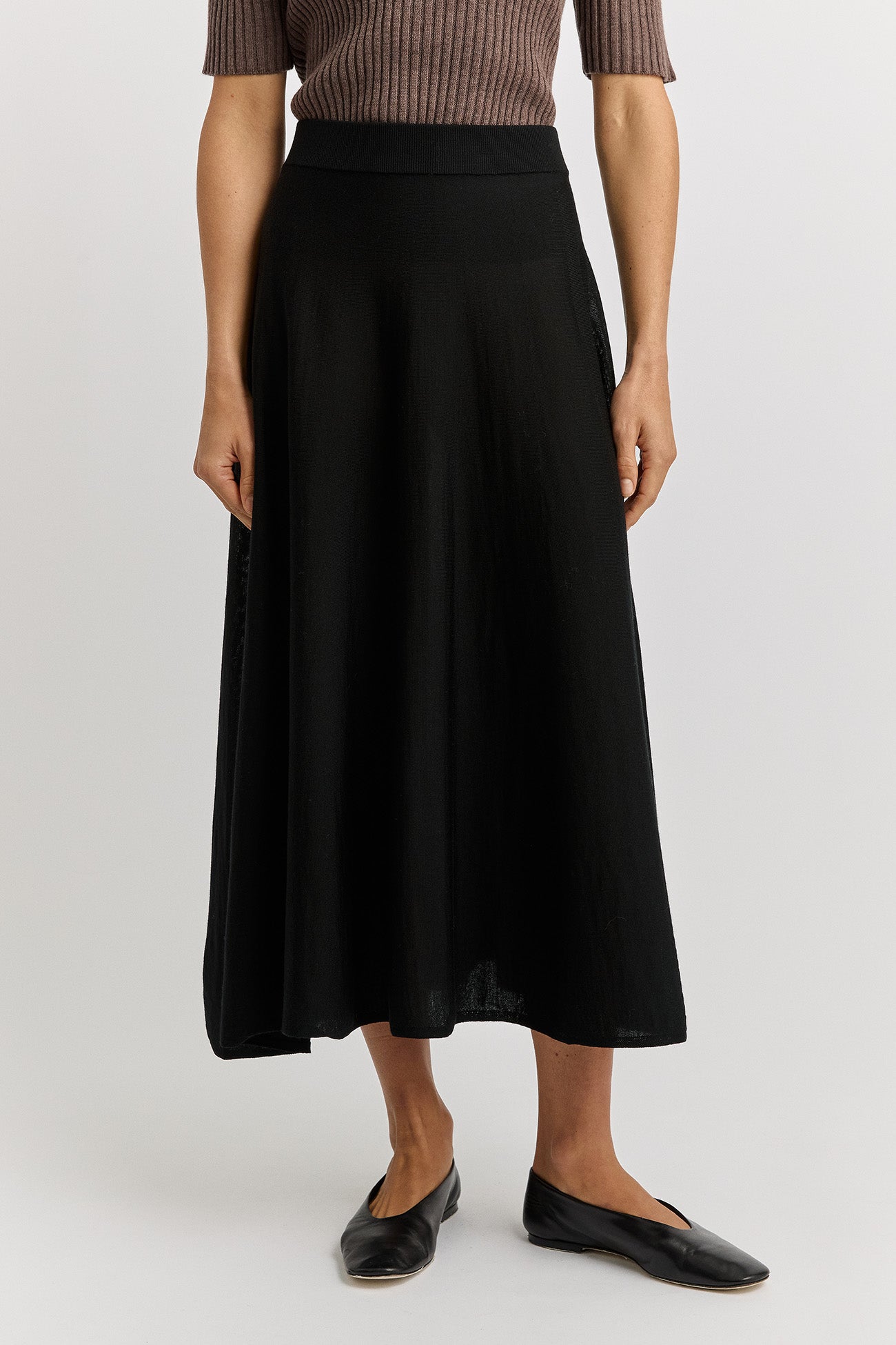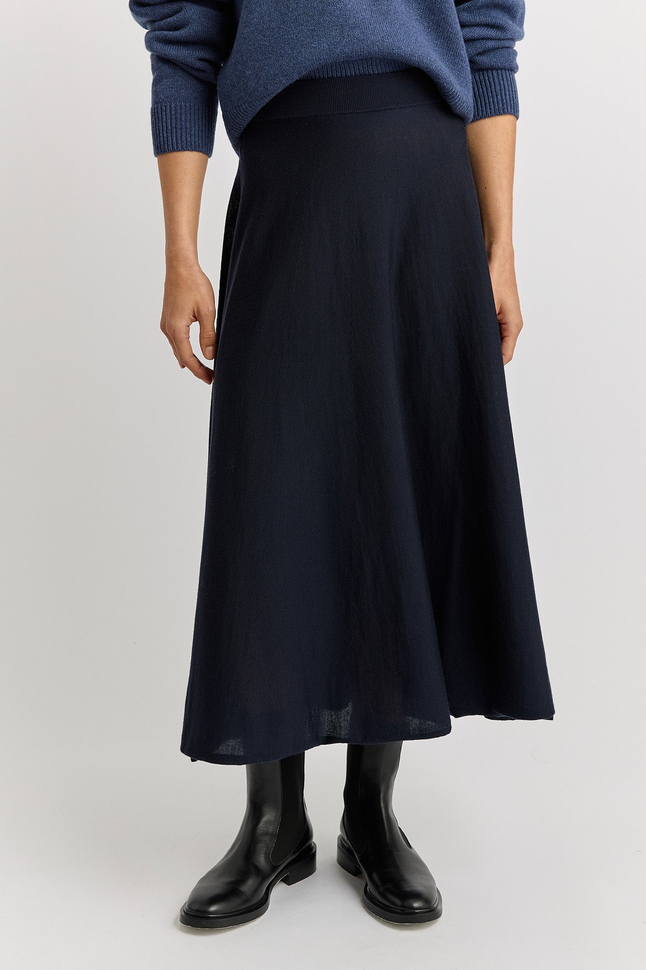 The A-Line Knit Midi Skirt is an extra fine knit skirt which sits at the high waist with an elasticated band, and falls to a flared mid calf length.