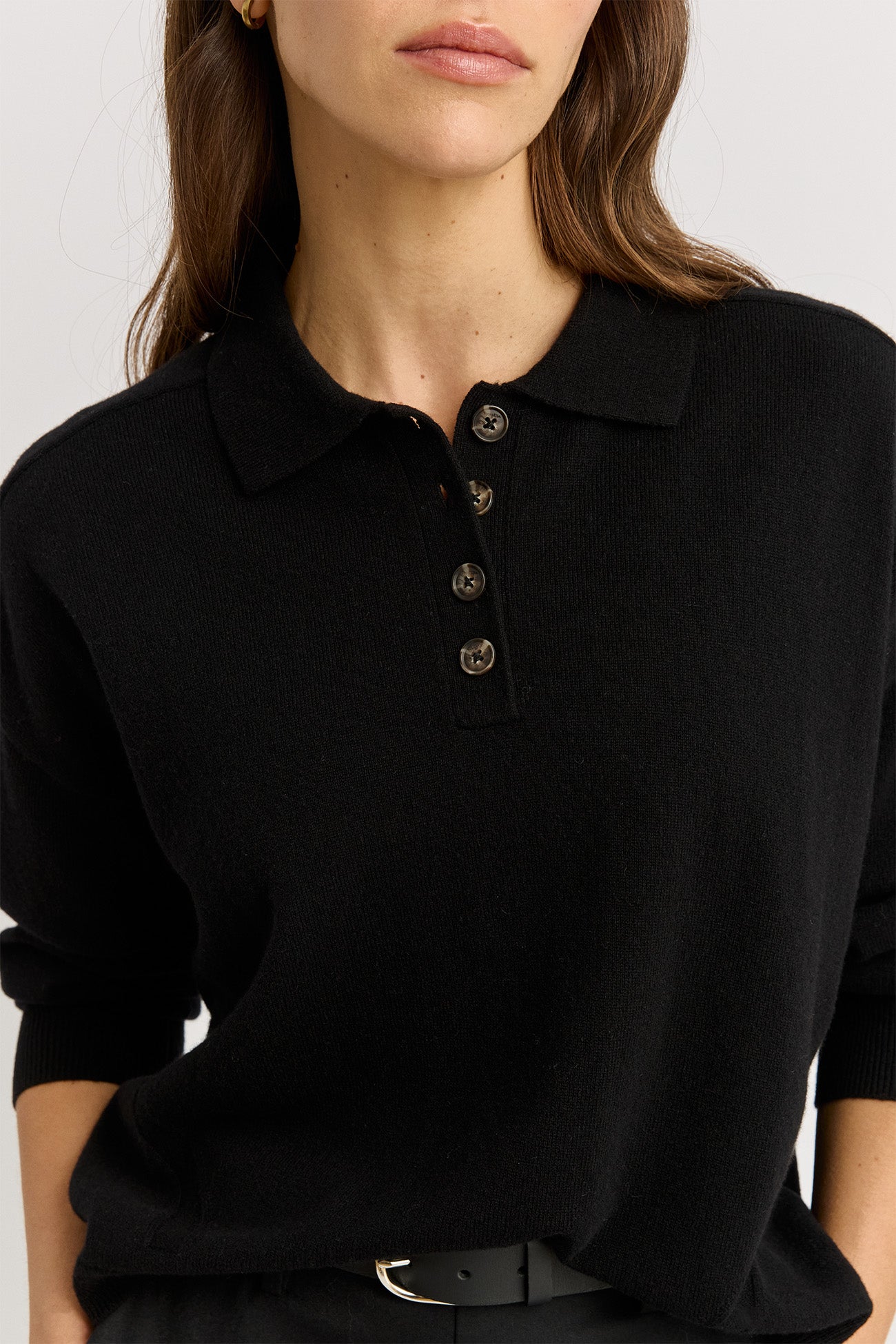 The Fine Jersey Polo has a polo collar and button-down neck. The cropped length features drop shoulders, a relaxed silhouette, and is detailed with a textured stitch across the front shoulders and side waist.