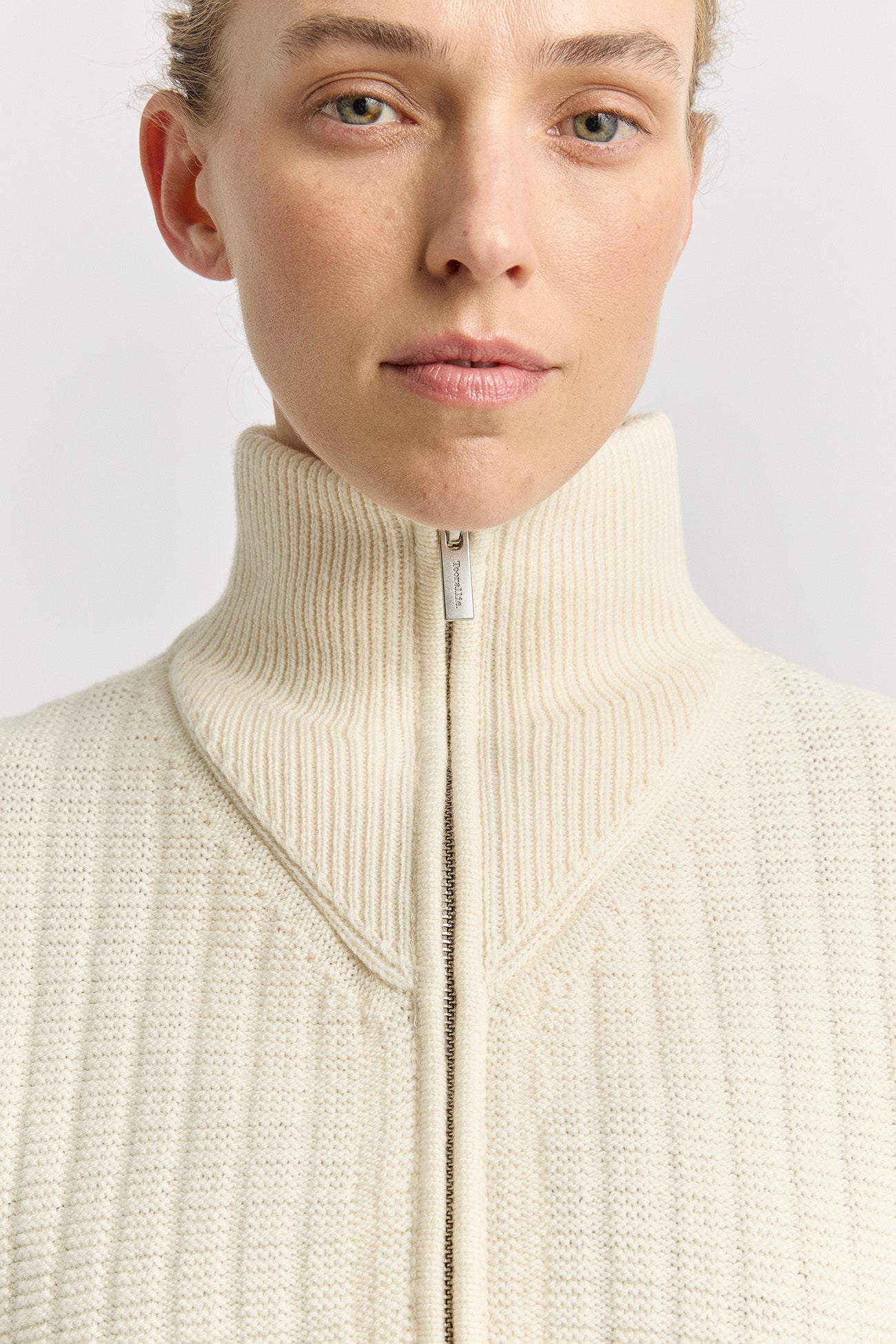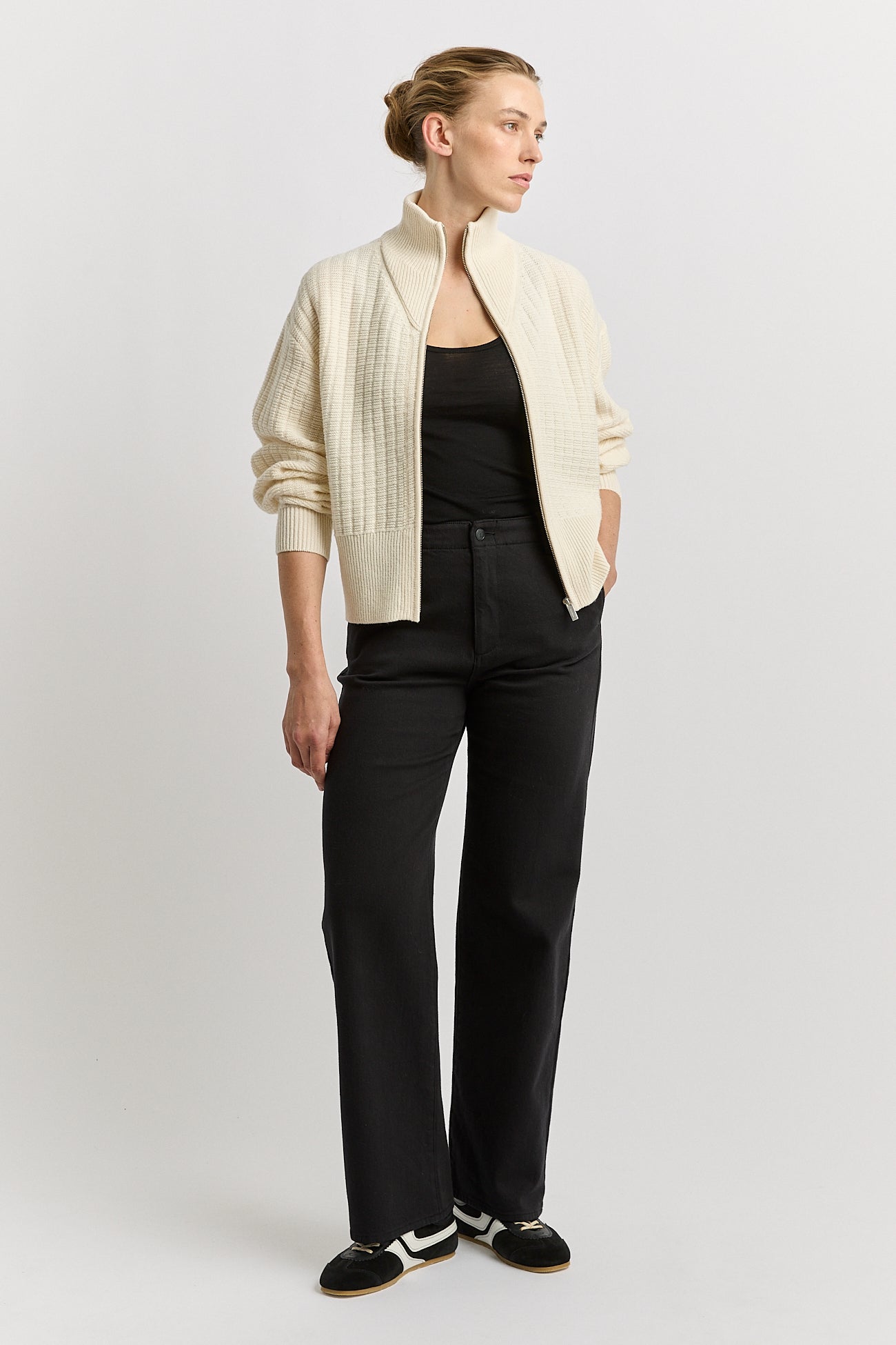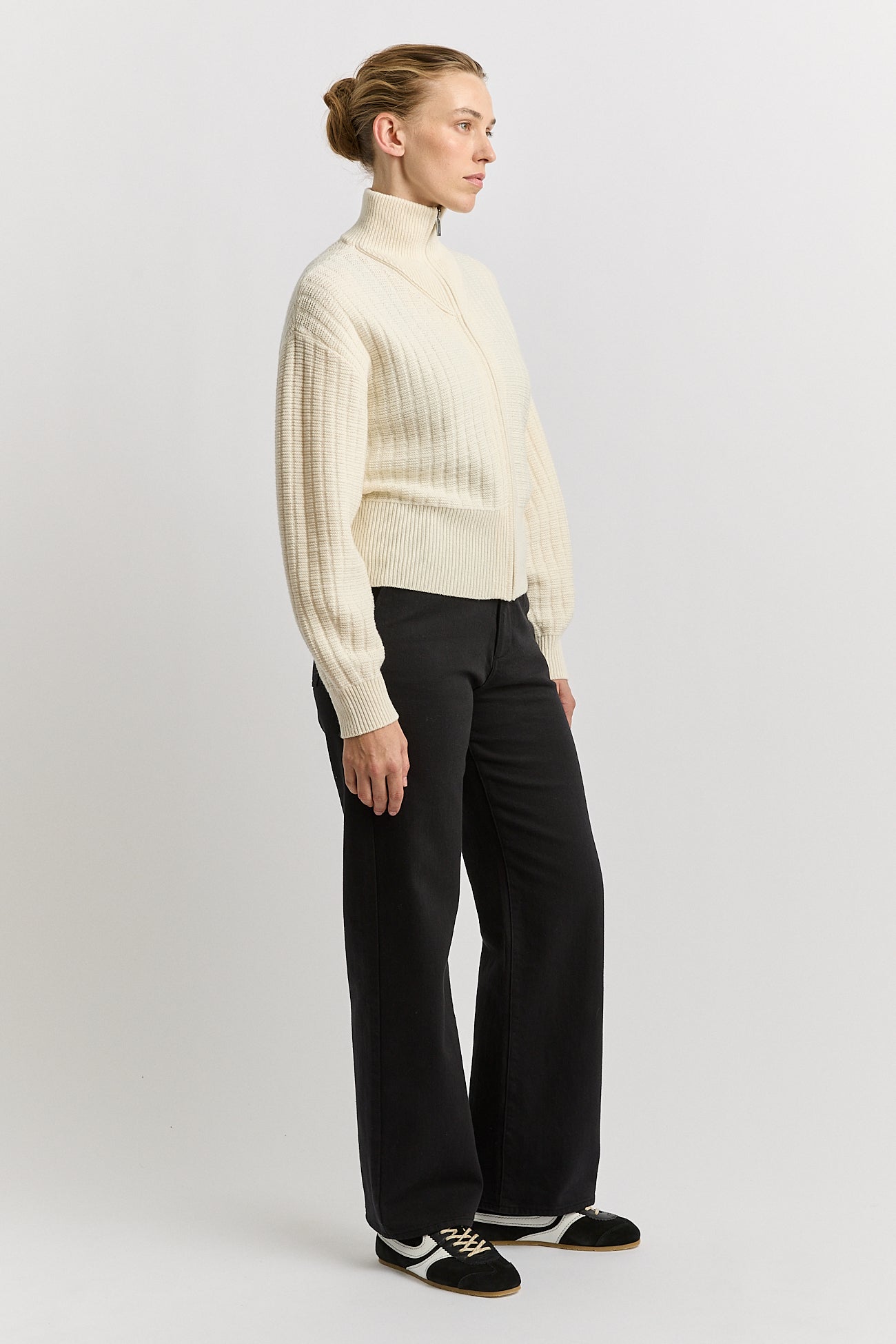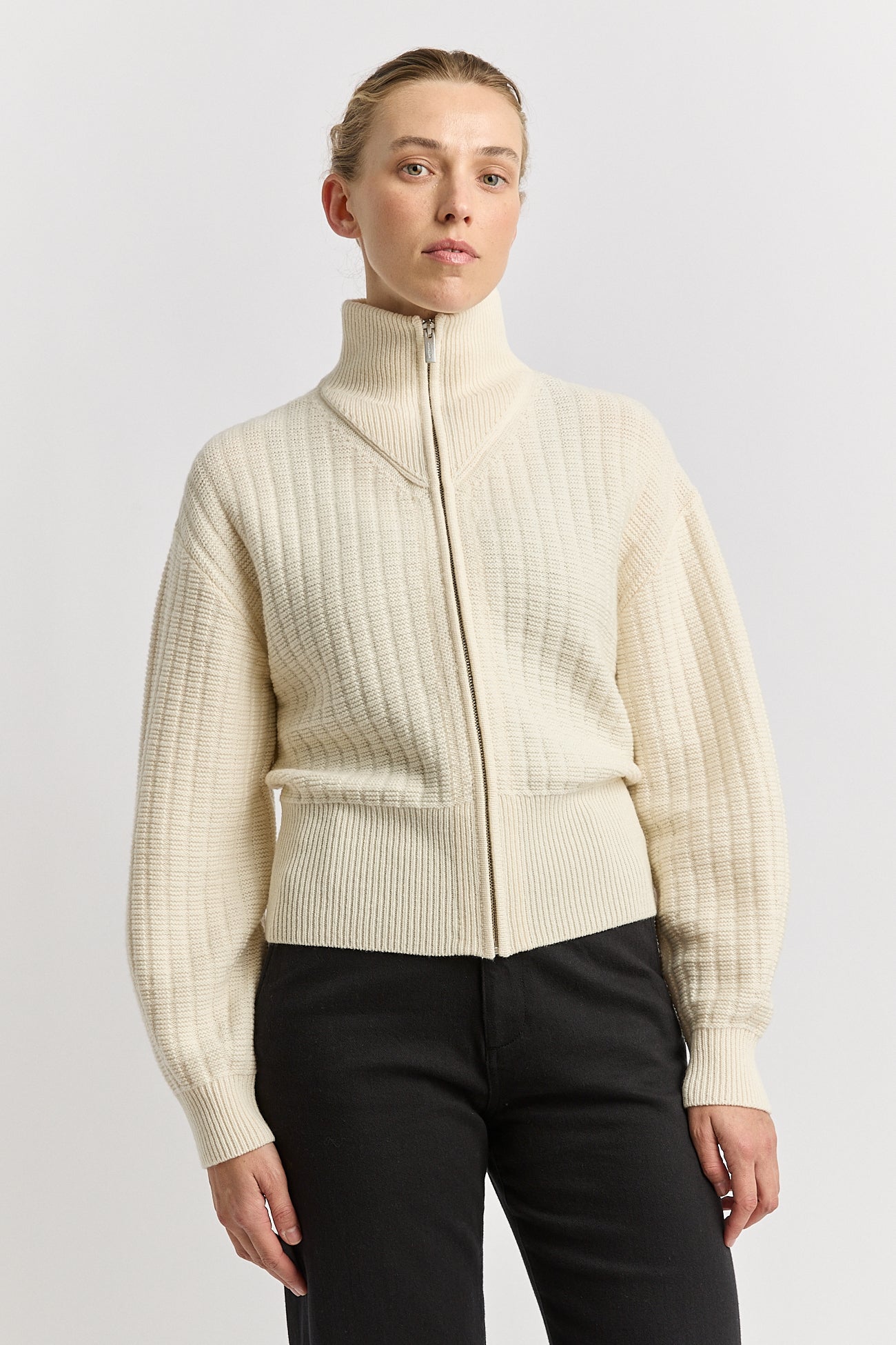 The Grid Knit Zip Through Cardigan is textured with an alternating raised and flat geometric grid knit. The relaxed fit has a high, standing collar and waistband both detailed with a rib knit. It fastens with a branded zip, and has slightly rounded sleeves to fit easily over winter layers.