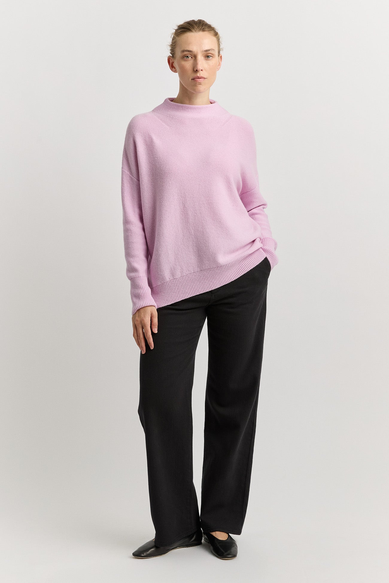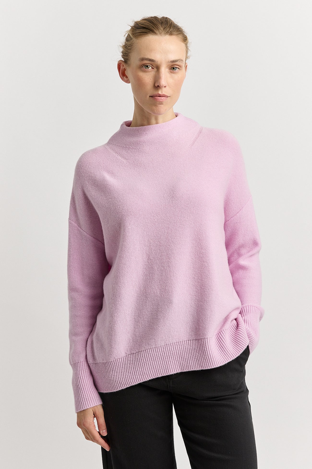 The Drop Shoulder Mock Neck is a relaxed style with a wide standing neck, slim sleeves, and finished with a rib trim.