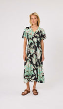 This allover serene print midi dress is made of cotton viscose. V neck opening and set in armhole with circular cut sleeves. Invisible zipper opening at left side seam. It has a separate self fabric rouleaux belt with metal ends that can be wear with or without.
