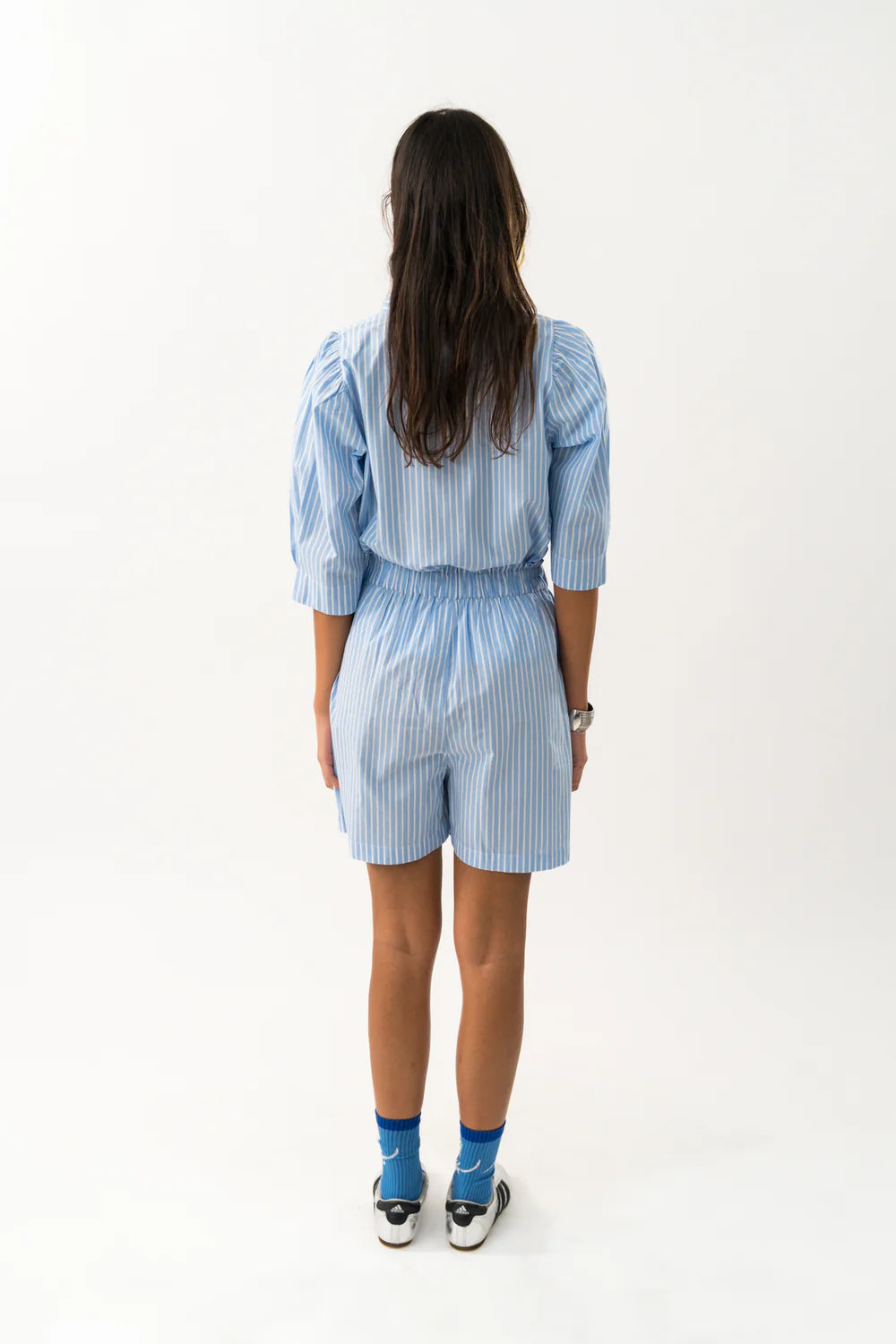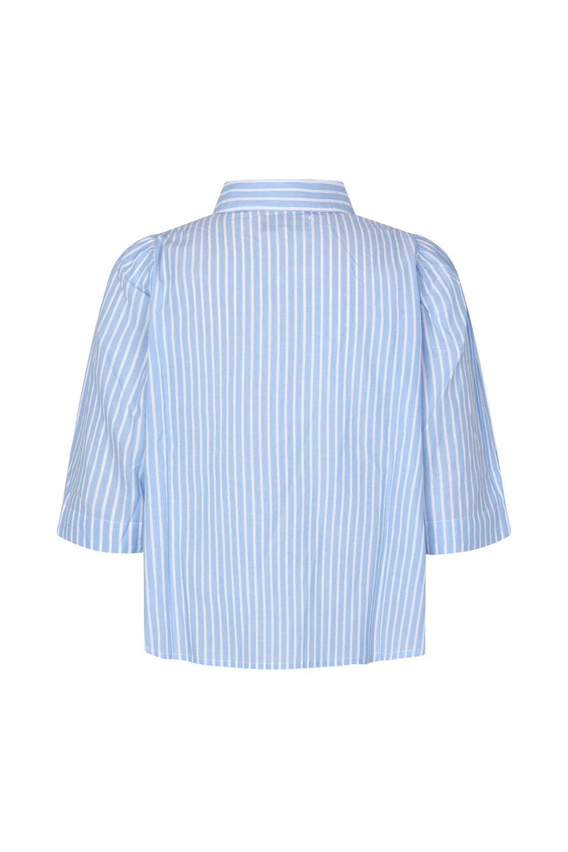 The Bono shirt is a classic blouse with a modern twist. The fresh blue stripes give it a timeless look, while the slightly puffed sleeves add a feminine touch.
