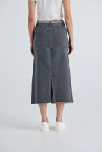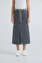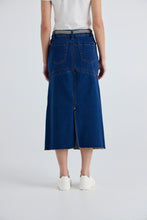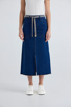 Elevate your denim collection with the Rhode Skirt, a midi-length design crafted with a contrast top-stitched panels for added detail. The bias-cut lower skirt and shaped back darts ensure an exceptionally flattering fit. Complete with a splits, featuring rivet detail and a removable herringbone weave belt with metal tie ends, this skirt exudes both style and versatility.