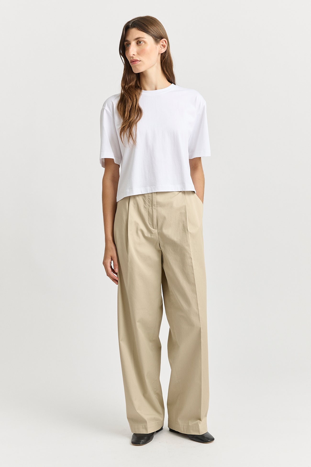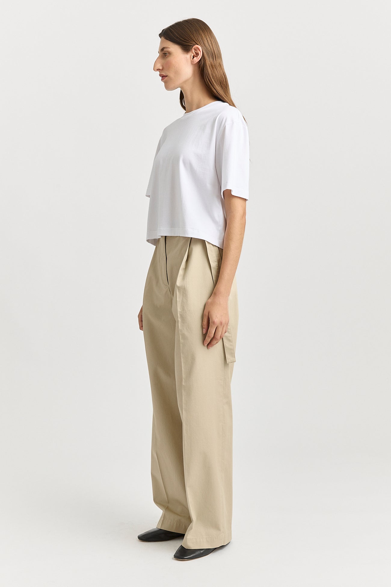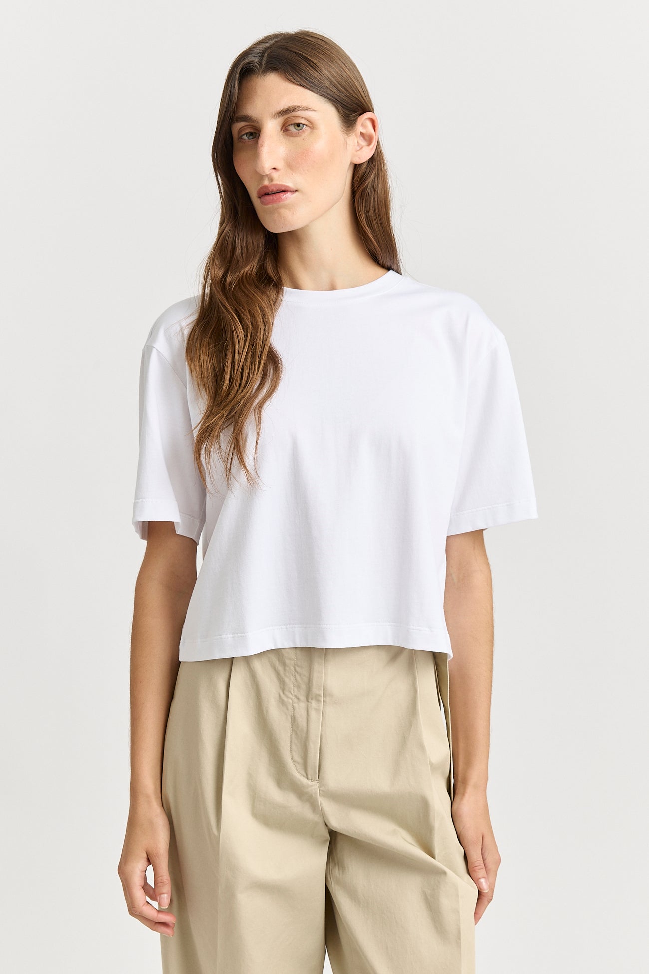 The Relaxed Crop Tee has a relaxed shape that sits off the body, finishing at the waist. The short sleeves end just above the elbow. Cut from American grown 100% SUPIMA® Cotton.