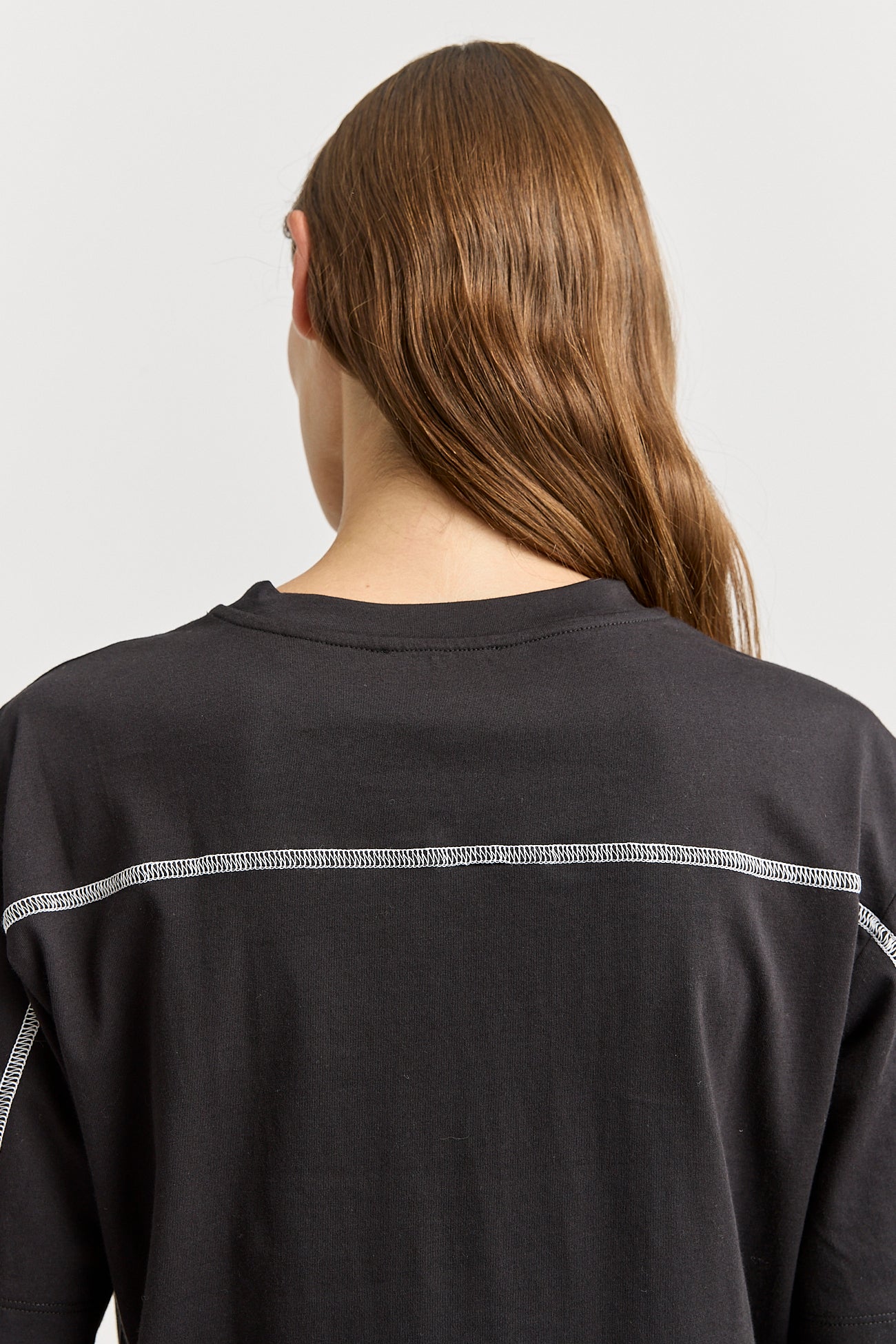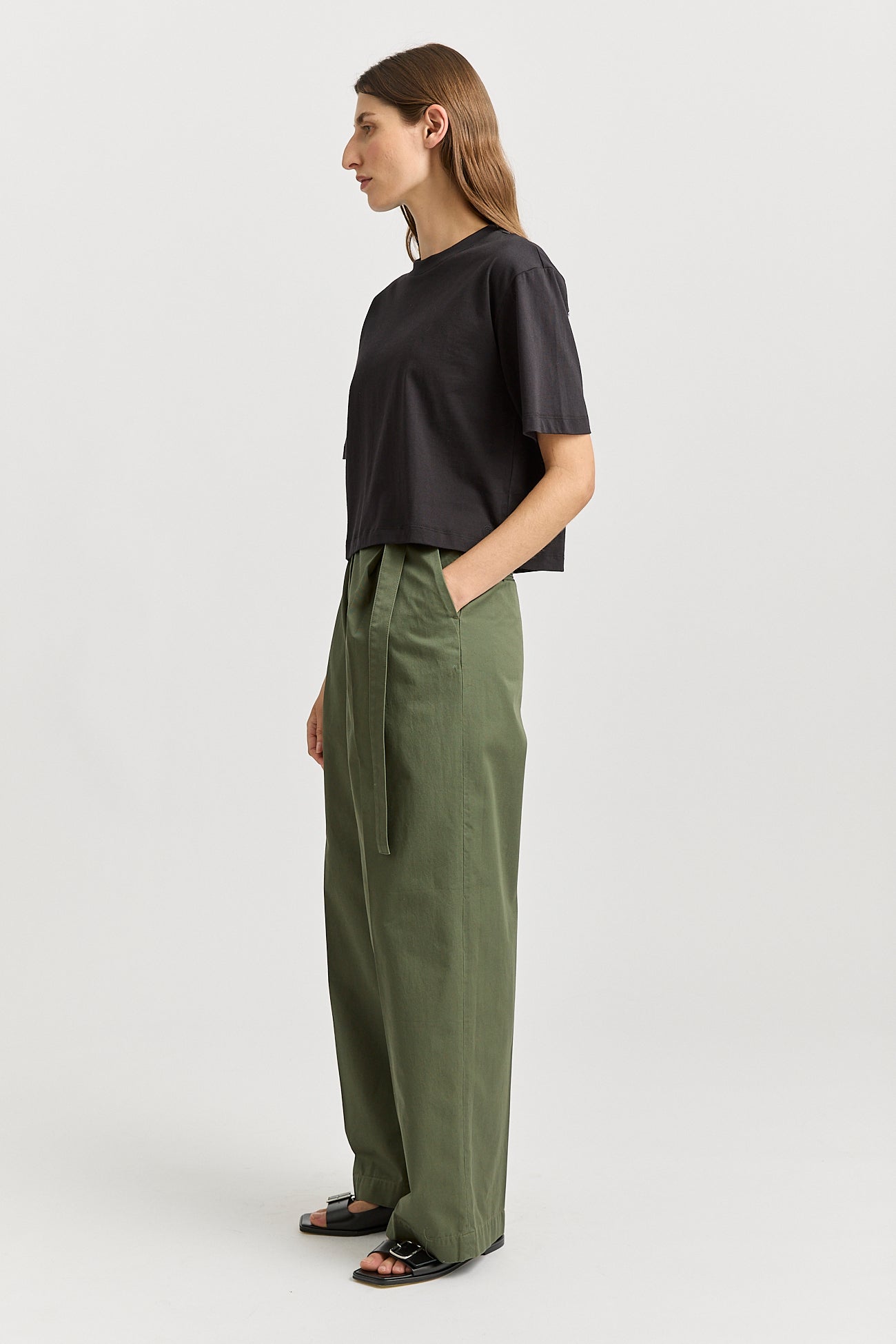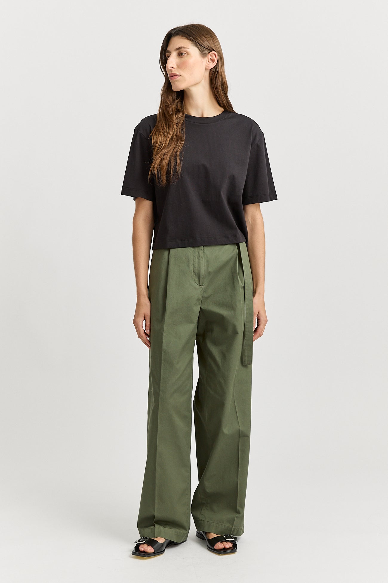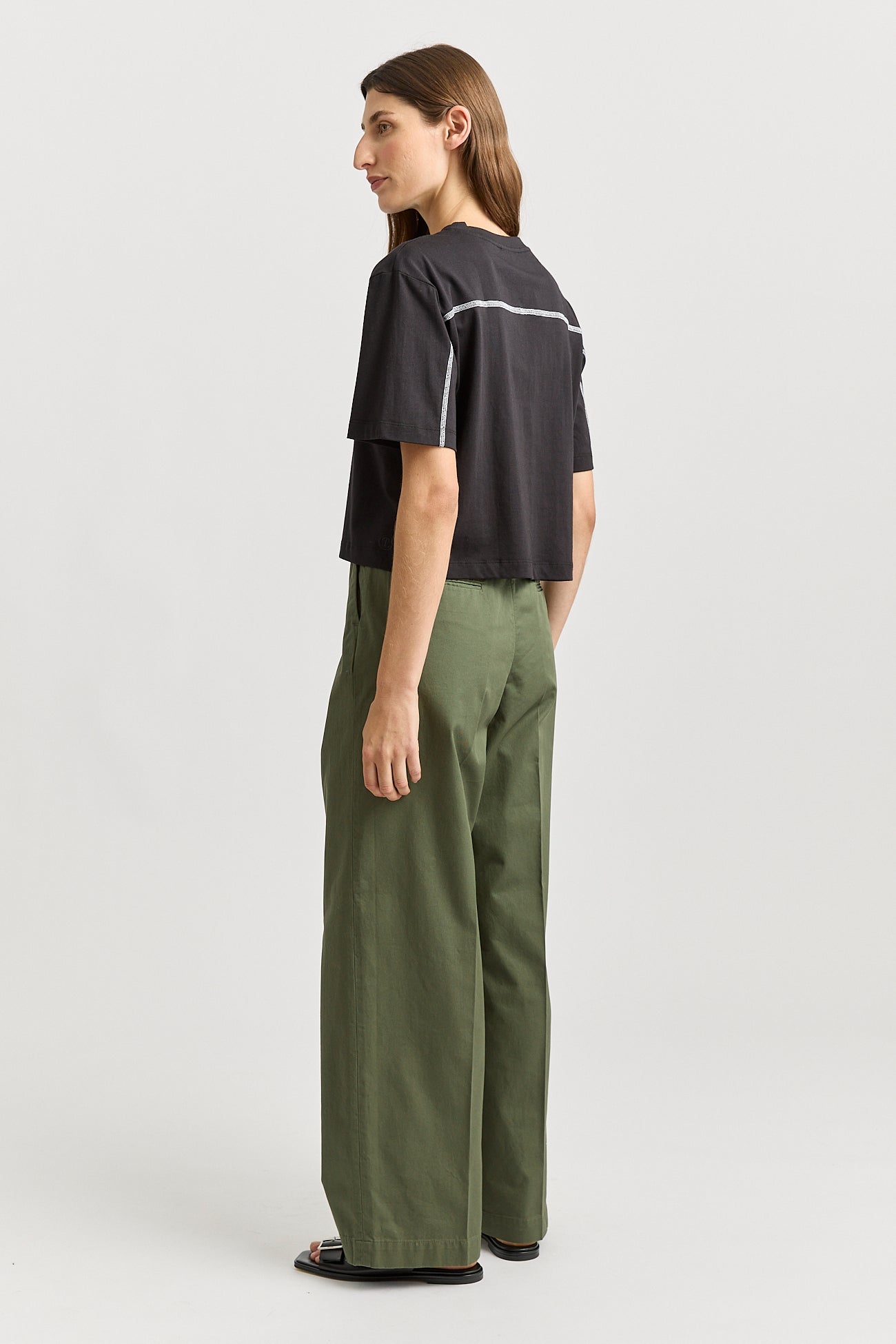 The Relaxed Crop Tee has a relaxed shape that sits off the body, finishing at the waist. The short sleeves end just above the elbow. Cut from American grown 100% SUPIMA® Cotton.