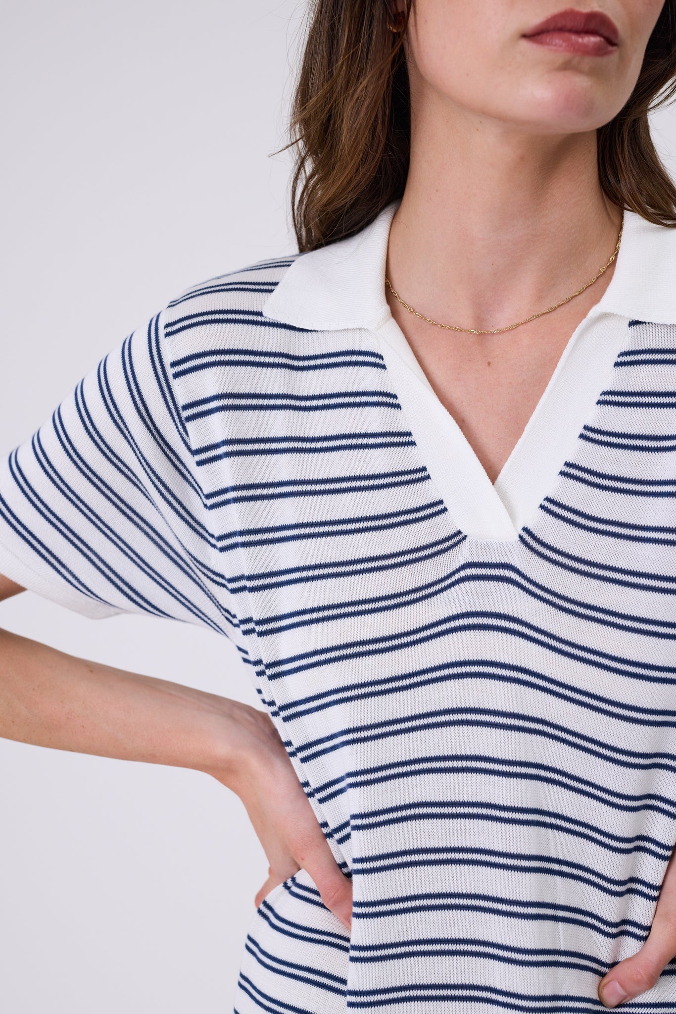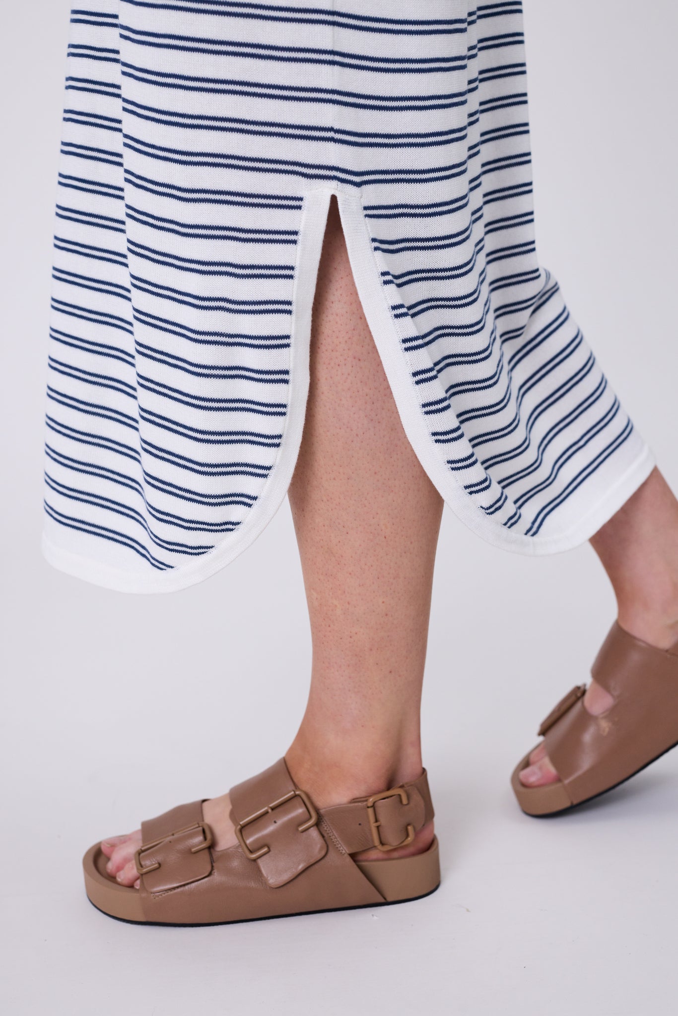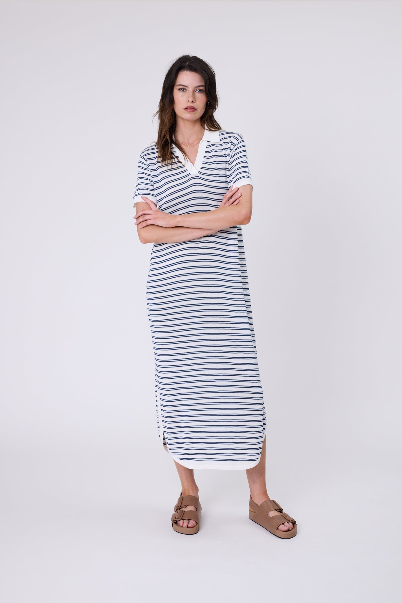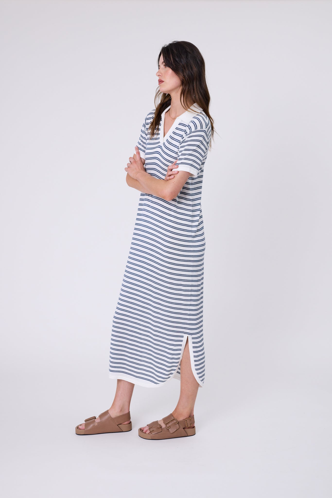 The Chime Knit Polo Dress in Indigo Stripe offers an effortless silhouette that balances comfort with style. Crafted in a custom stripe knit with an ivory base and indigo blue stripes, it’s made from a premium cotton-modal blend that combines the strength and breathability of cotton with the silky softness and drape of modal. The result is a lightweight, durable yarn that feels smooth and luxurious against the skin. Designed with a relaxed fit and straight cut, this polo tee dress falls to a midi-to-maxi length, finished with short sleeves, a quarter placket, side splits and a curved hem for added movement and shape. Style it with a cap and sneakers for errands on the go, or switch to sandals for a beach-to-brunch ready look.