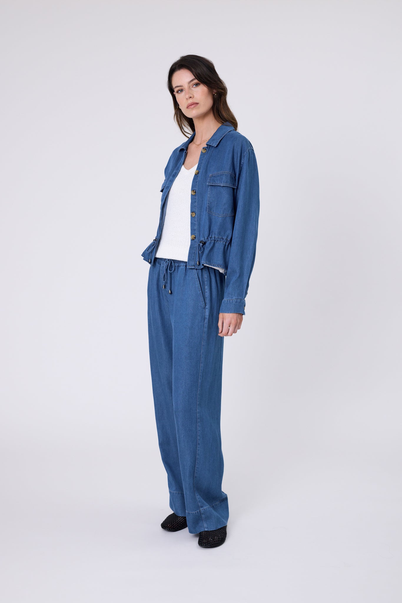Where shirt styling meets jacket versatility - the Fresco Jacket in Mid Wash is your effortless transeasonal layer. Cut from soft tencel fabric, it brings a balance of polish and detail, designed for everyday wear. The relaxed, cropped silhouette sits neatly at the hip, with an adjustable bungee drawcord to cinch the waist and define the shape. Button it up for a clean, refined look, or leave it undone and roll the sleeves for a more relaxed feel. Layer it over a dress or tank, or pair with the matching Fresco Pant or Vista Longline Short for a coordinated set.