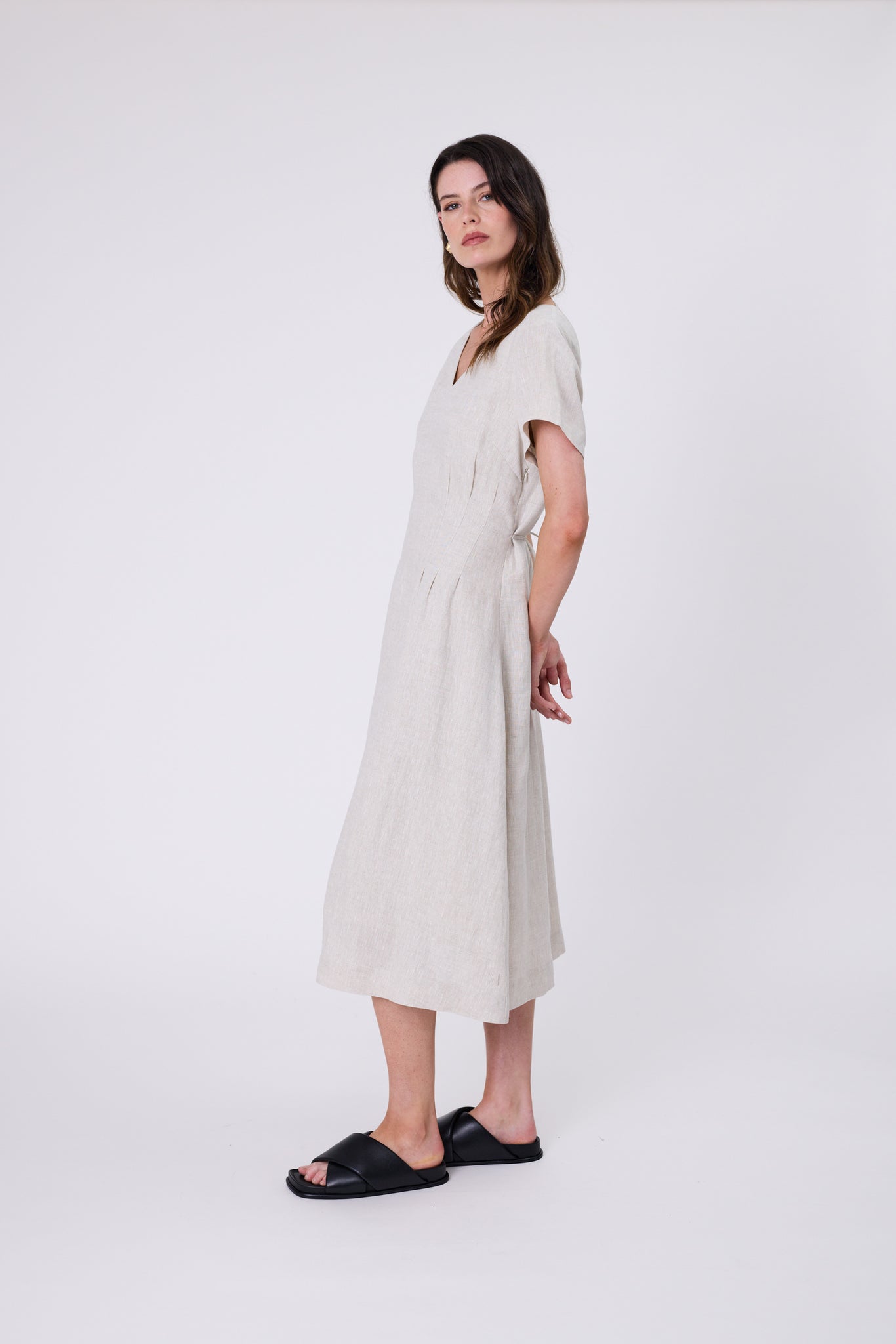 Sophisticated yet effortless, the Seville Linen Dress offers an elevated refresh of our best-selling silhouette. Cut from premium European linen with a naturally refined drape, it features a V-neckline and back, short sleeves, and shaping darts through the waist. The adjustable self-ties can be fastened at the front or back to create a personalised fit for every occasion. Pair with flat sandals for lunch at the vineyard, or dress up with heels and a clutch for a polished evening look.