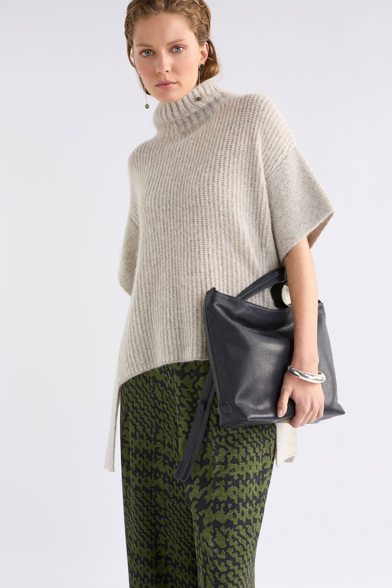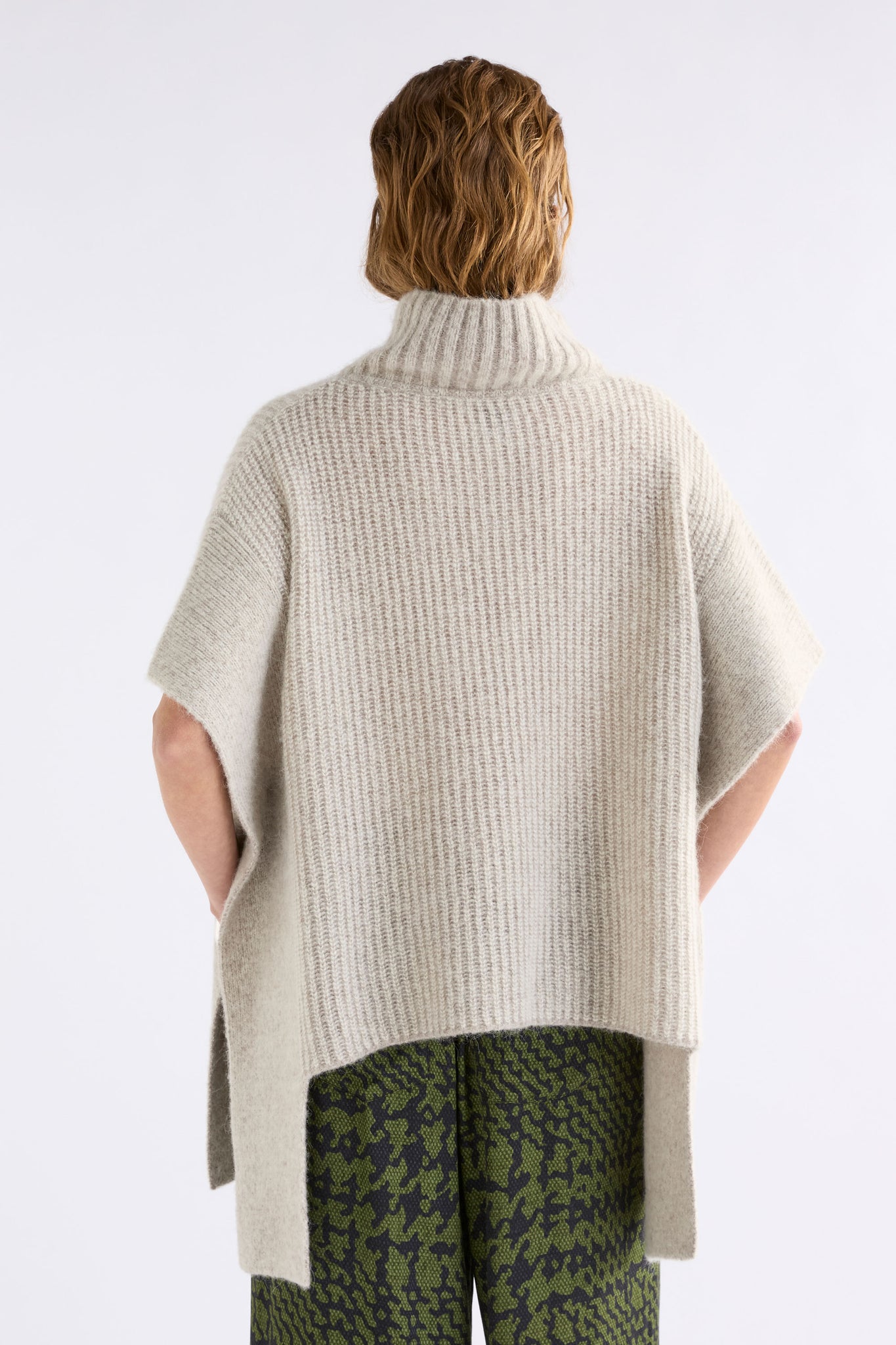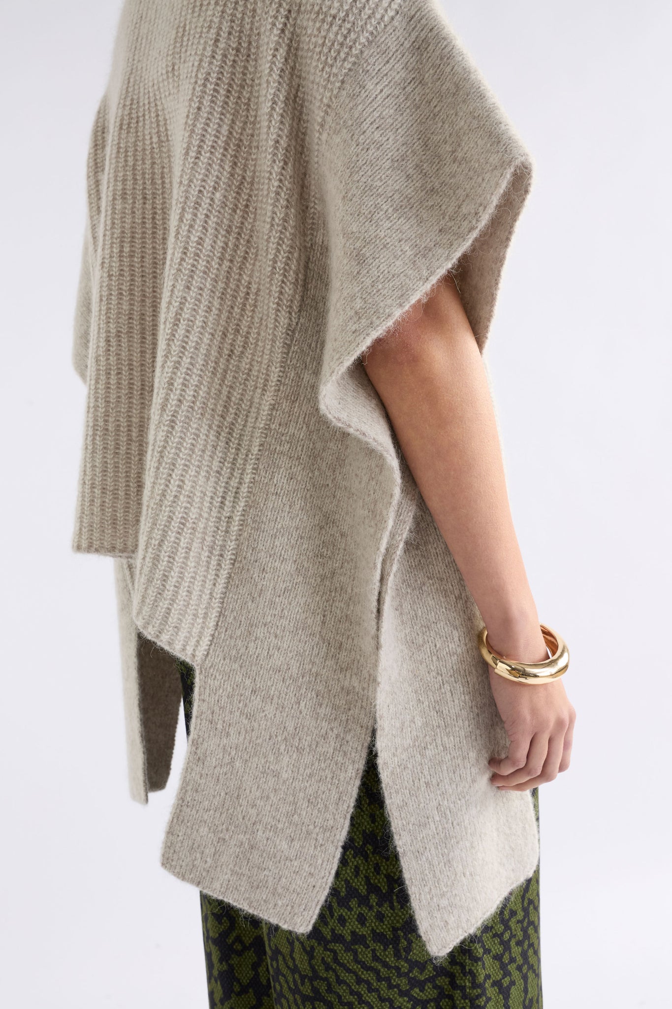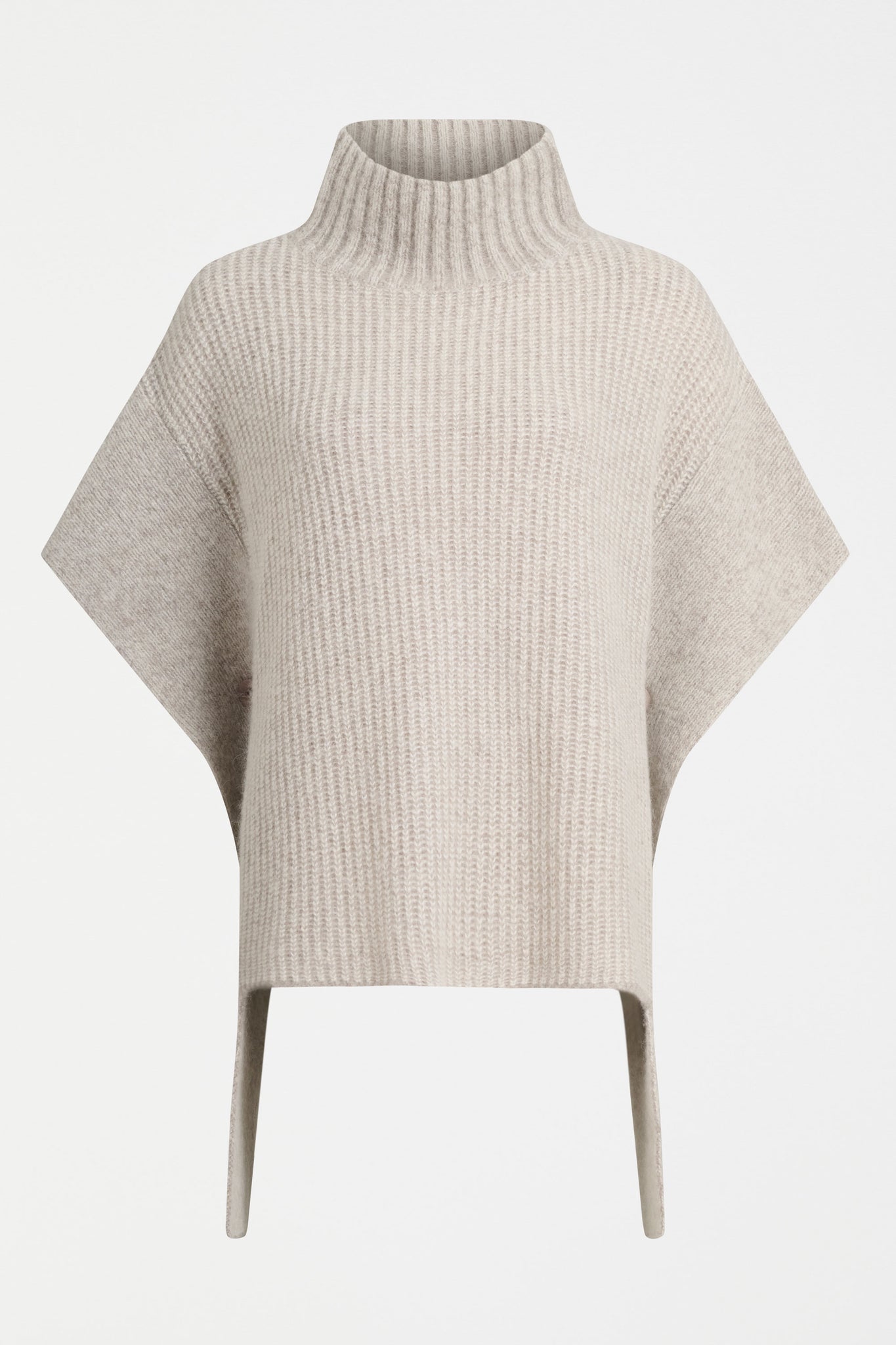 The Aleph Poncho is a boxy turtleneck style crafted from a luxuriously soft blend of merino wool, alpaca and recycled nylon, in a two-tone mix of oat and flax coloured yarns. This ribbed knit, poncho-style silhouette features a high turtleneck collar, open sides with extended shoulder panels, and arm openings. A single button detail at the side seam allows for flexibility in shape and styling, while the high-low hem adds interest. A statement layering piece for cooler weather. Wear over our fine merino knit basics or neater fit knits.