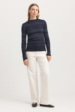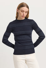 The Gradient Stripe Funnel fits close to the body with a low funnel neck. Knitted in a fine rib stitch with a graduating stripe design.