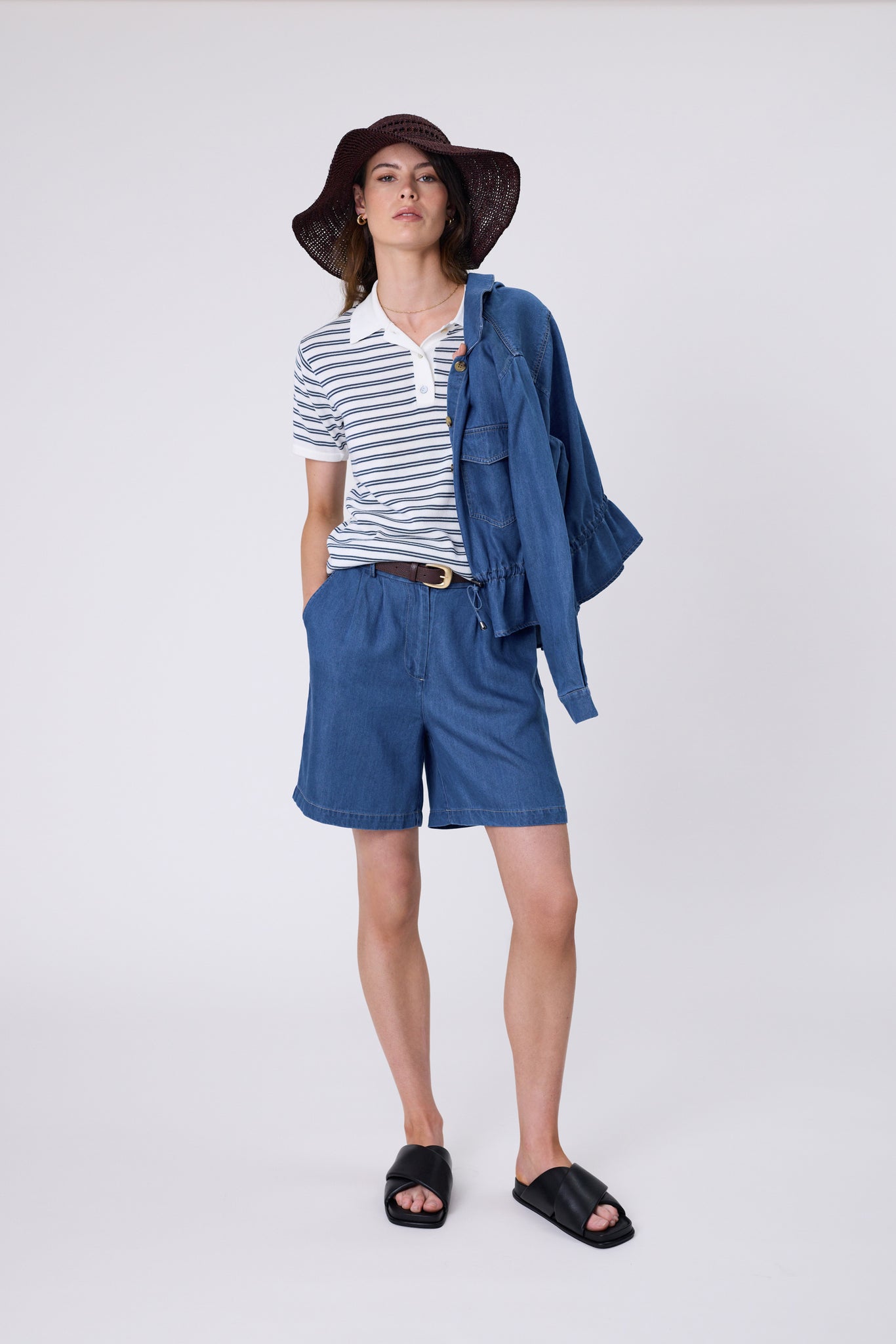 The Chime Knit Polo in Indigo Stripe is a modern take on a timeless favourite, crafted in a custom stripe knit with an ivory base and indigo blue accents. Made from a premium cotton-modal blend, it combines the strength and breathability of cotton with the silky softness and drape of modal, resulting in a lightweight, durable yarn that feels luxuriously smooth against the skin. Designed with a relaxed fit, short sleeves, a neat quarter placket and shell buttons, it strikes the perfect balance between casual and refined. Wear it with the Vista Bermuda Short for a laid-back feel or pair with your favourite Marlow Denim for an elevated everyday look.