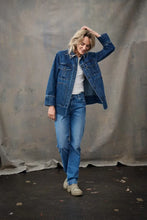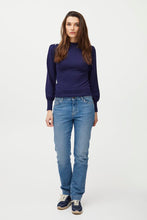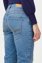 Jean de mezclilla azul medio con cintura media y piernas rectas de largo completo.