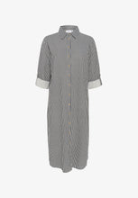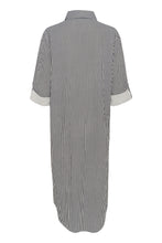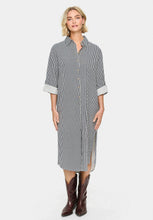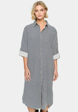 A navy and white striped shirt dress with button-down front and collar. Features a relaxed fit with long sleeves that can be rolled up, and a curved hem. The model is 176 cm tall and is wearing a size S.