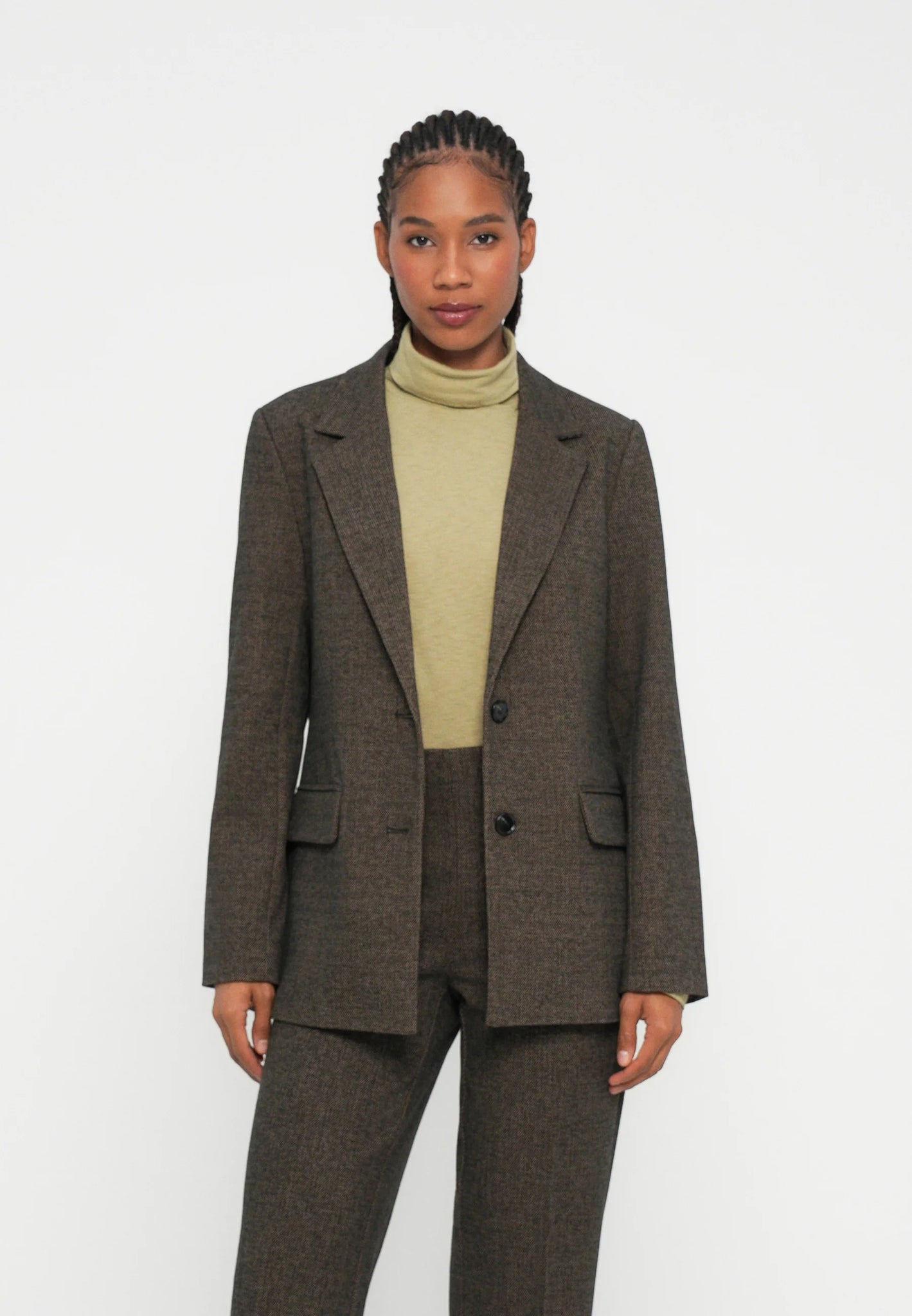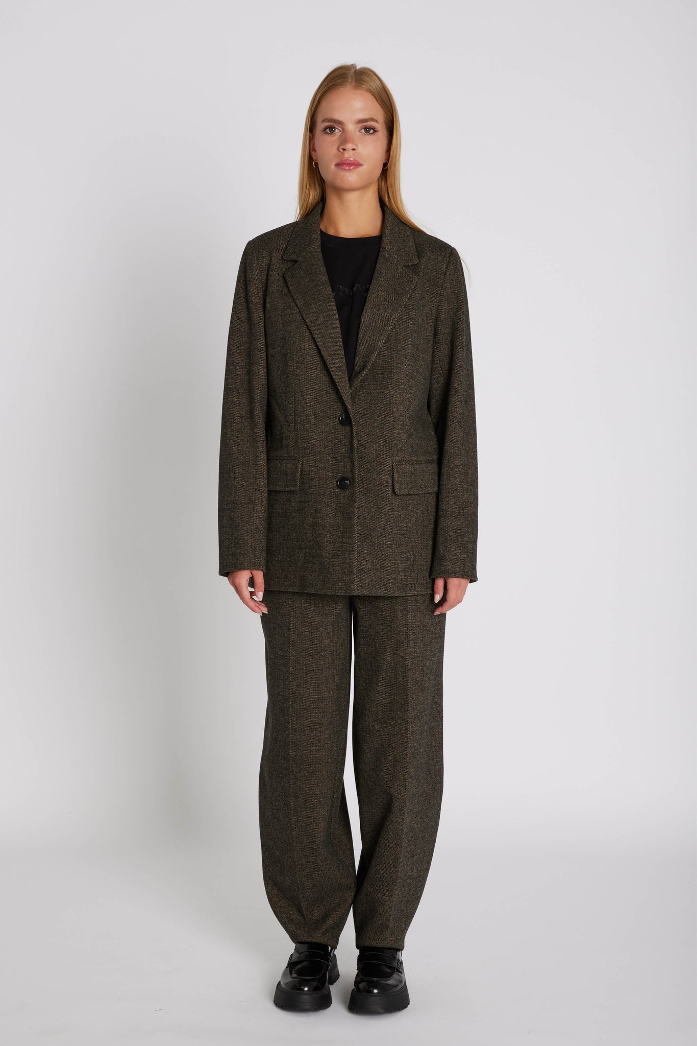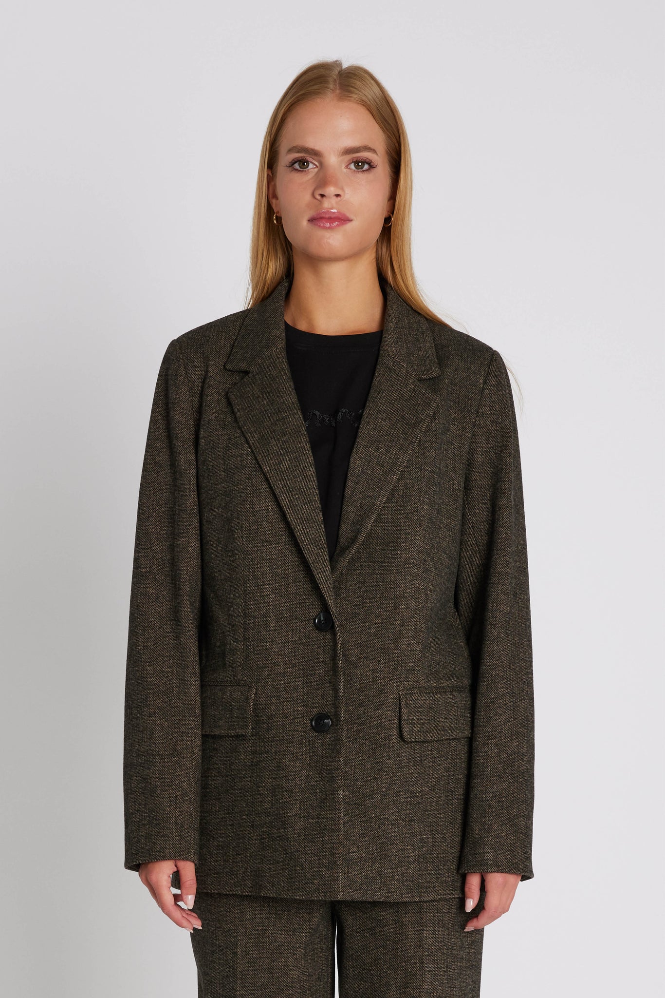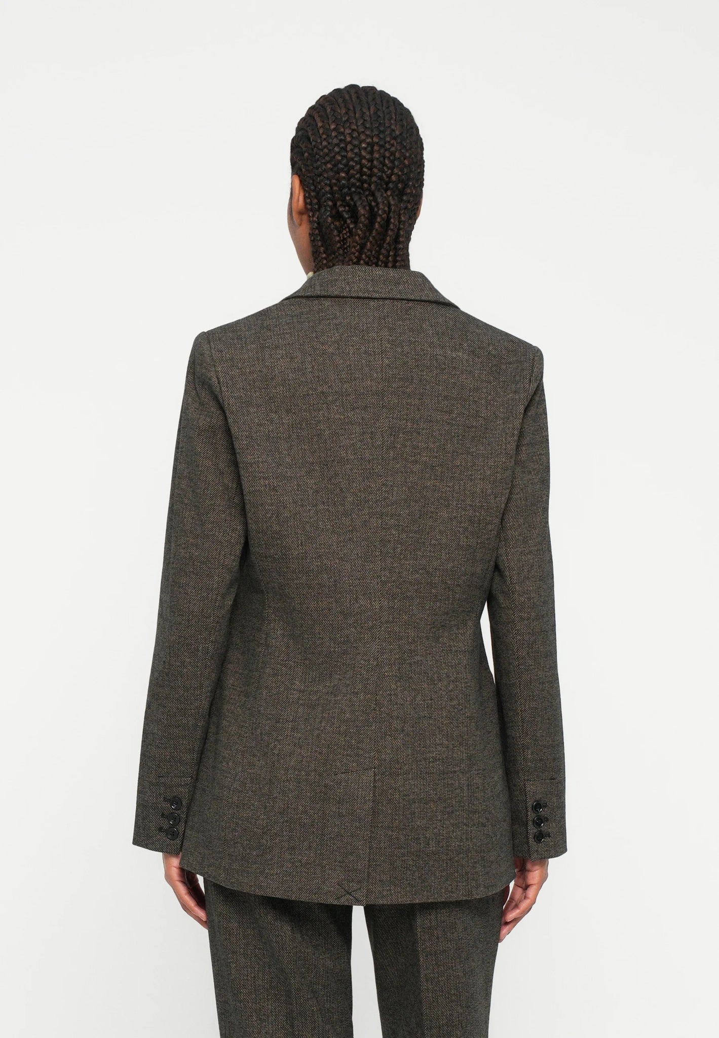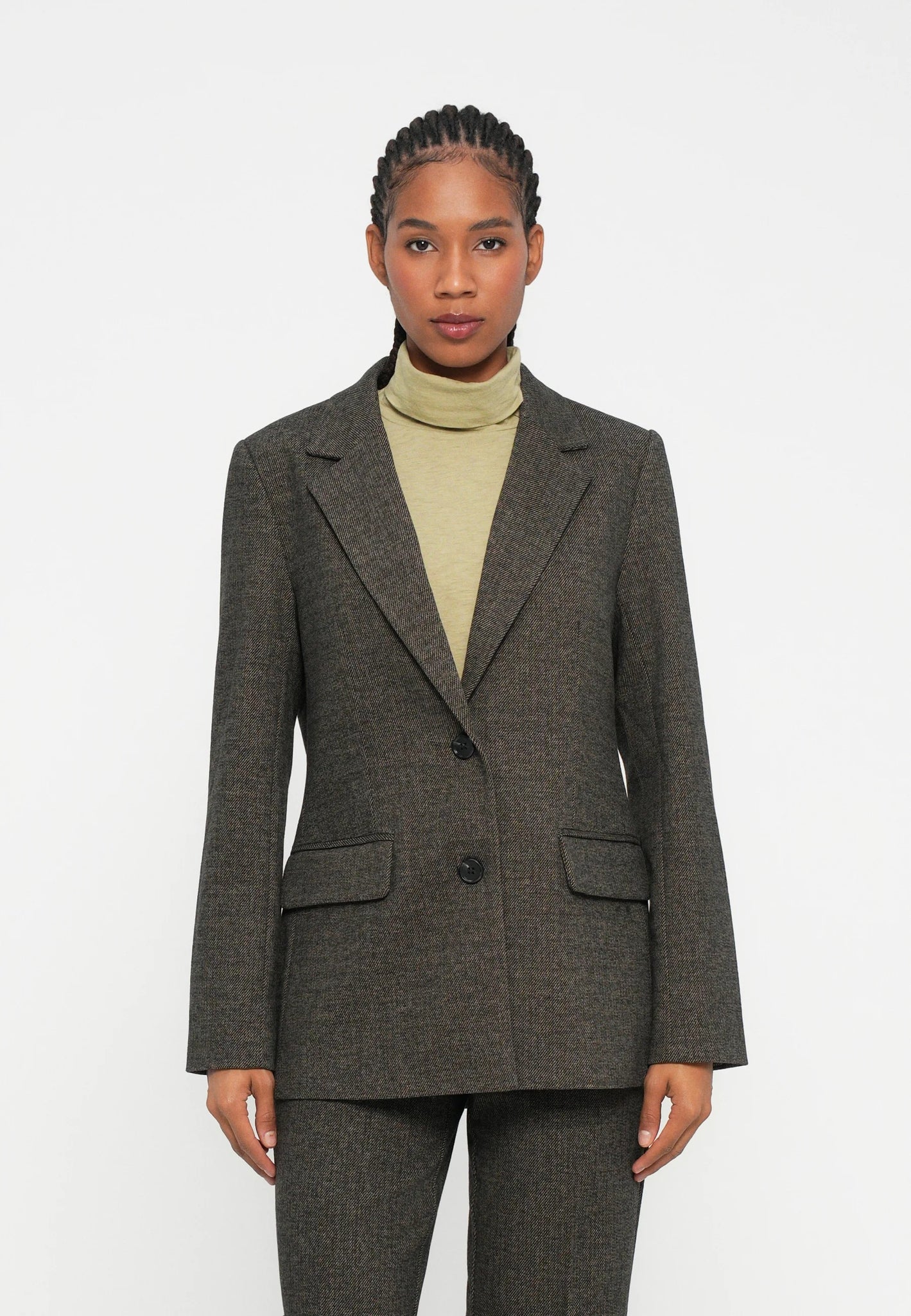 Elly is a sophisticated blazer with a classic cut and elegant lapels that accentuates a feminine, form-fitting silhouette.