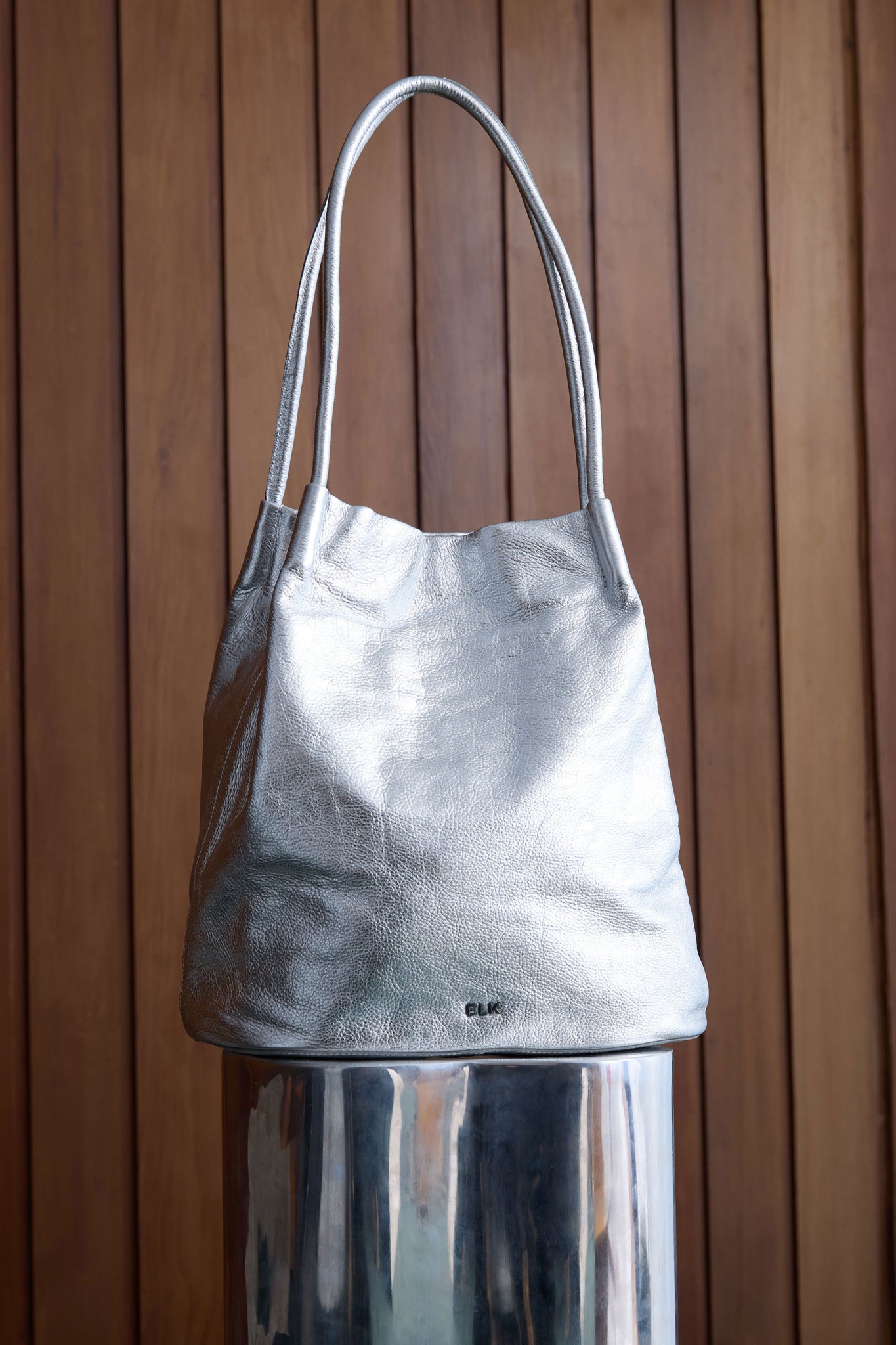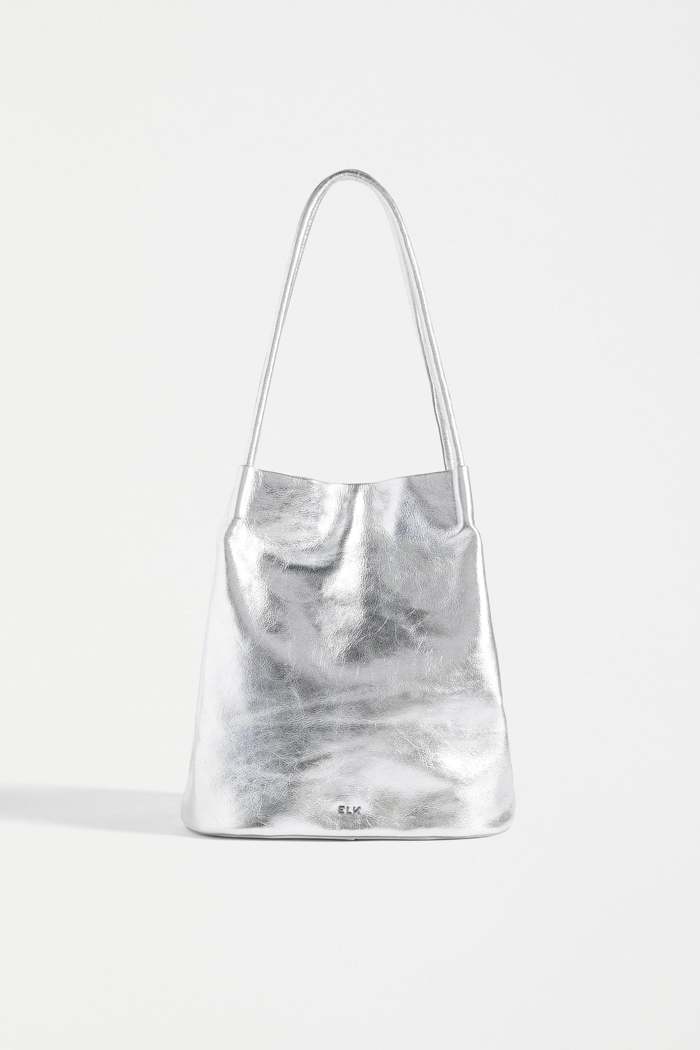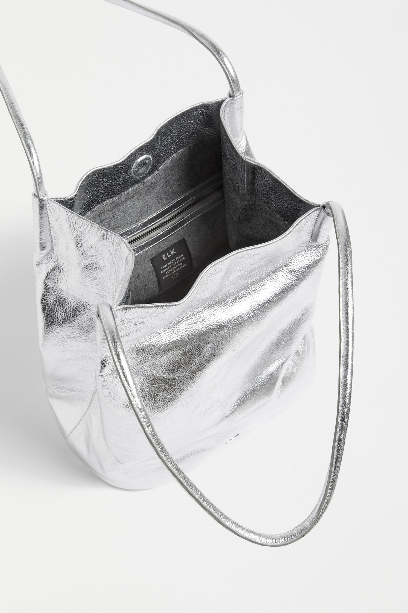 An ELK classic, well-loved design, the Orsa Handbag, now in a new fun metallic silver finish. This everyday, over the shoulder, carry-all, will add a statement pop of bold, playfulness to even the simplest outfit. Finished with a magnetic closure at the top and convenient pockets for your phone, smaller items plus a zippered pouch with ample space for your necessities. The oval base of the bag and the wide opening allows you to find items easily. This bag fits a 14 inch laptop.
