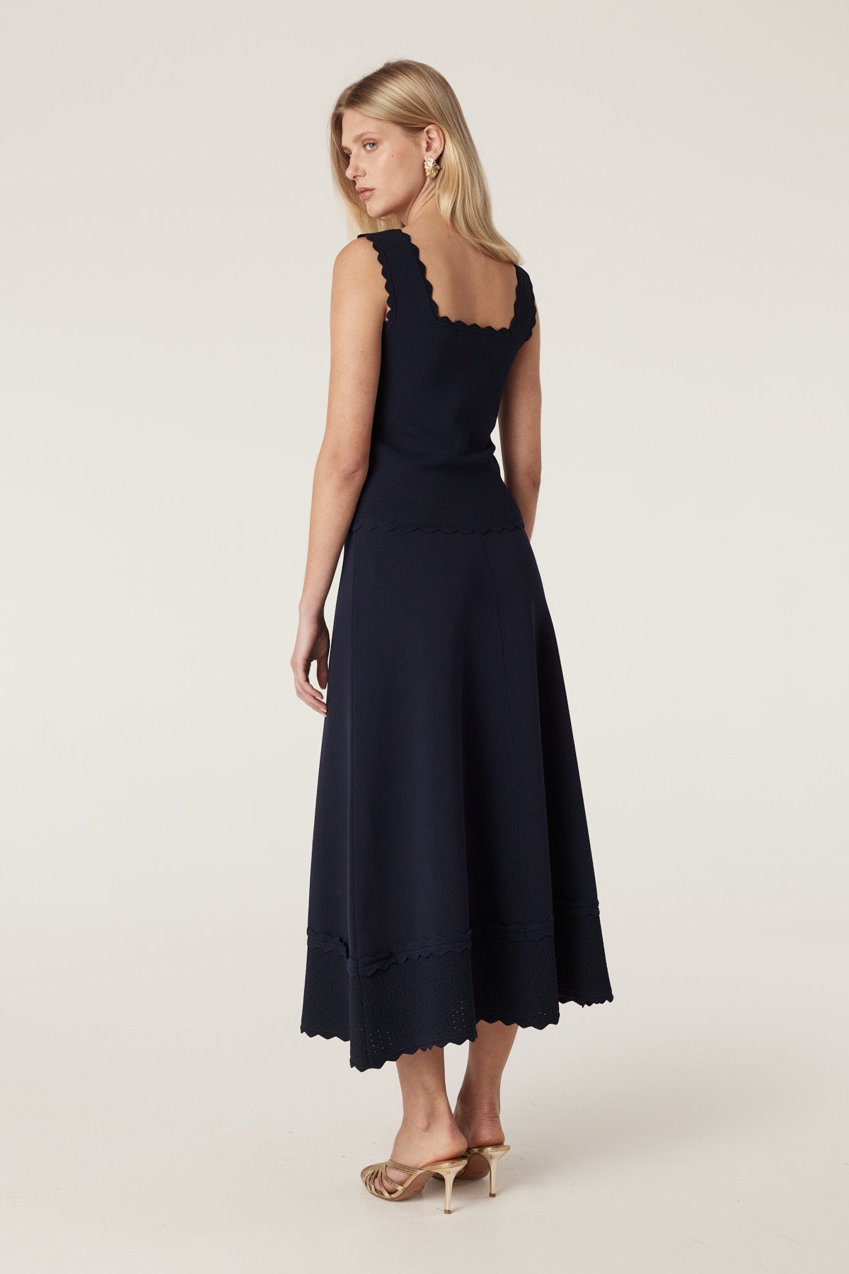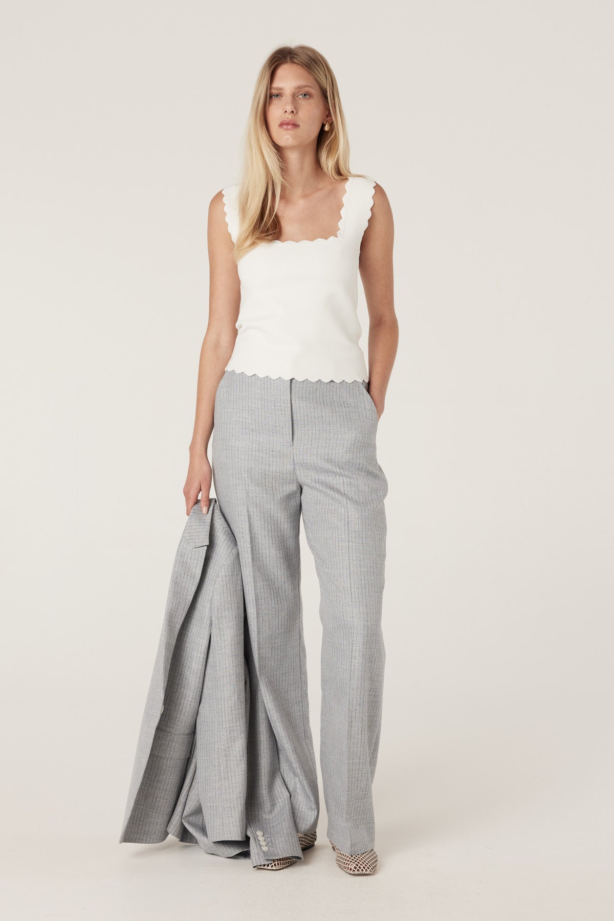 The Villa Crepe Knit Scallop Tank is a slim fit, medium-weight knit designed with a square neckline. Featuring scallop edge detailing at the neckline, armholes and hem.