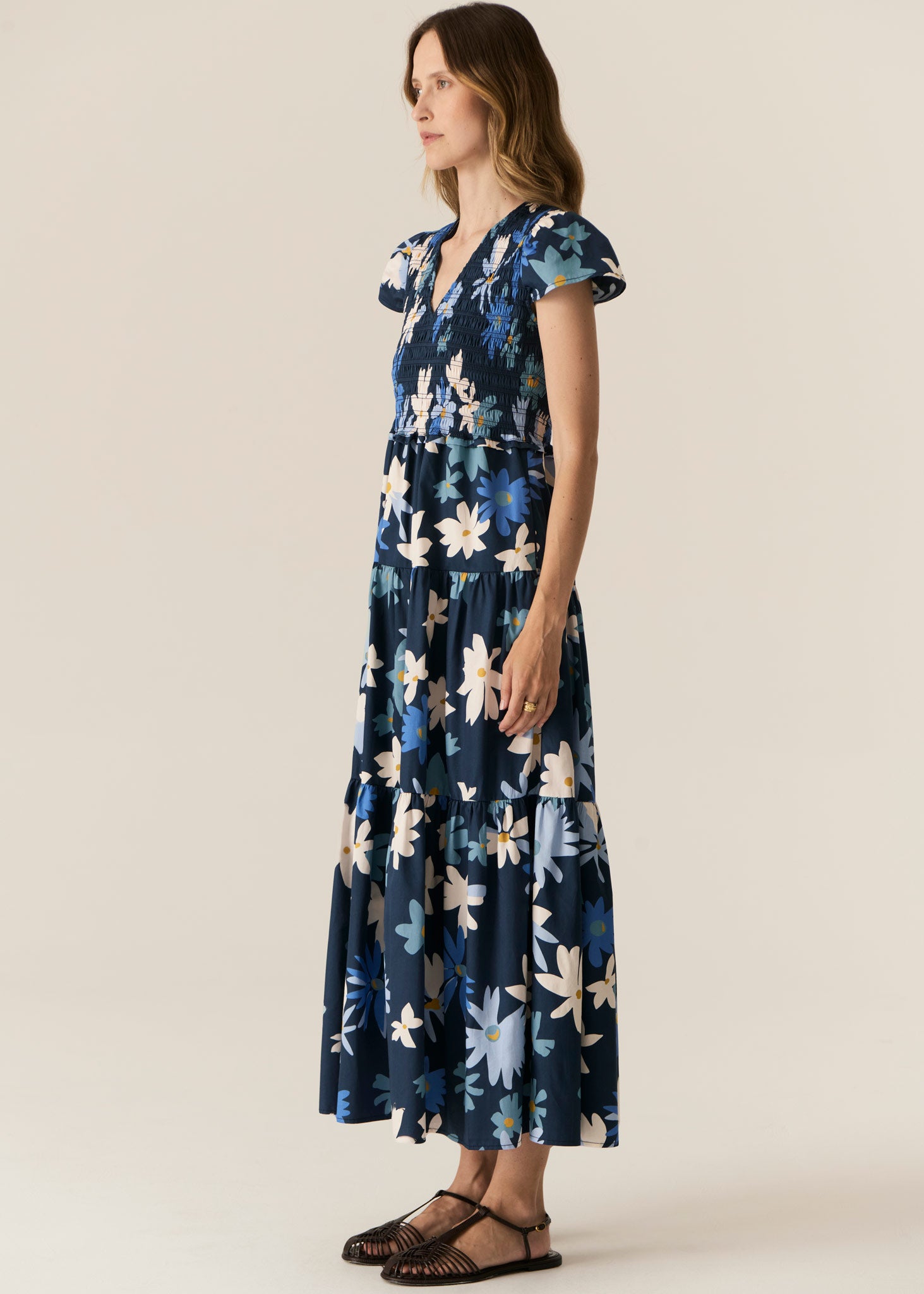 Featuring a shirred bodice for a fitted look without sacrificing comfort, the Savoy Shirred Dress features a gorgeous exclusive print floral print on a Navy base.