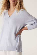 The Cotton Cashmere V-neck Jumper offers a regular fit in a lightweight knit made from a traceable cotton cashmere yarn. It features raglan sleeves and exposed seam detail on both the front and back with a front hem split, enhancing its casual style.