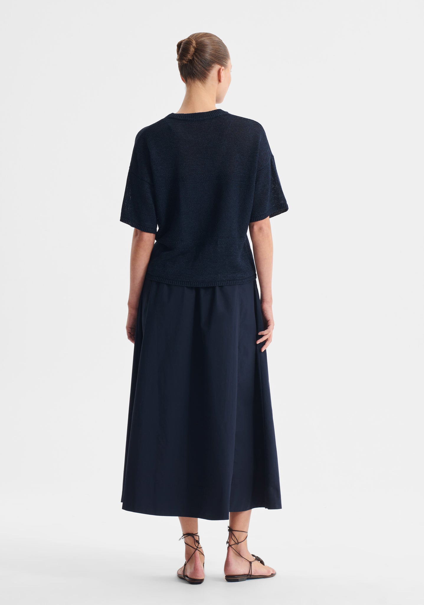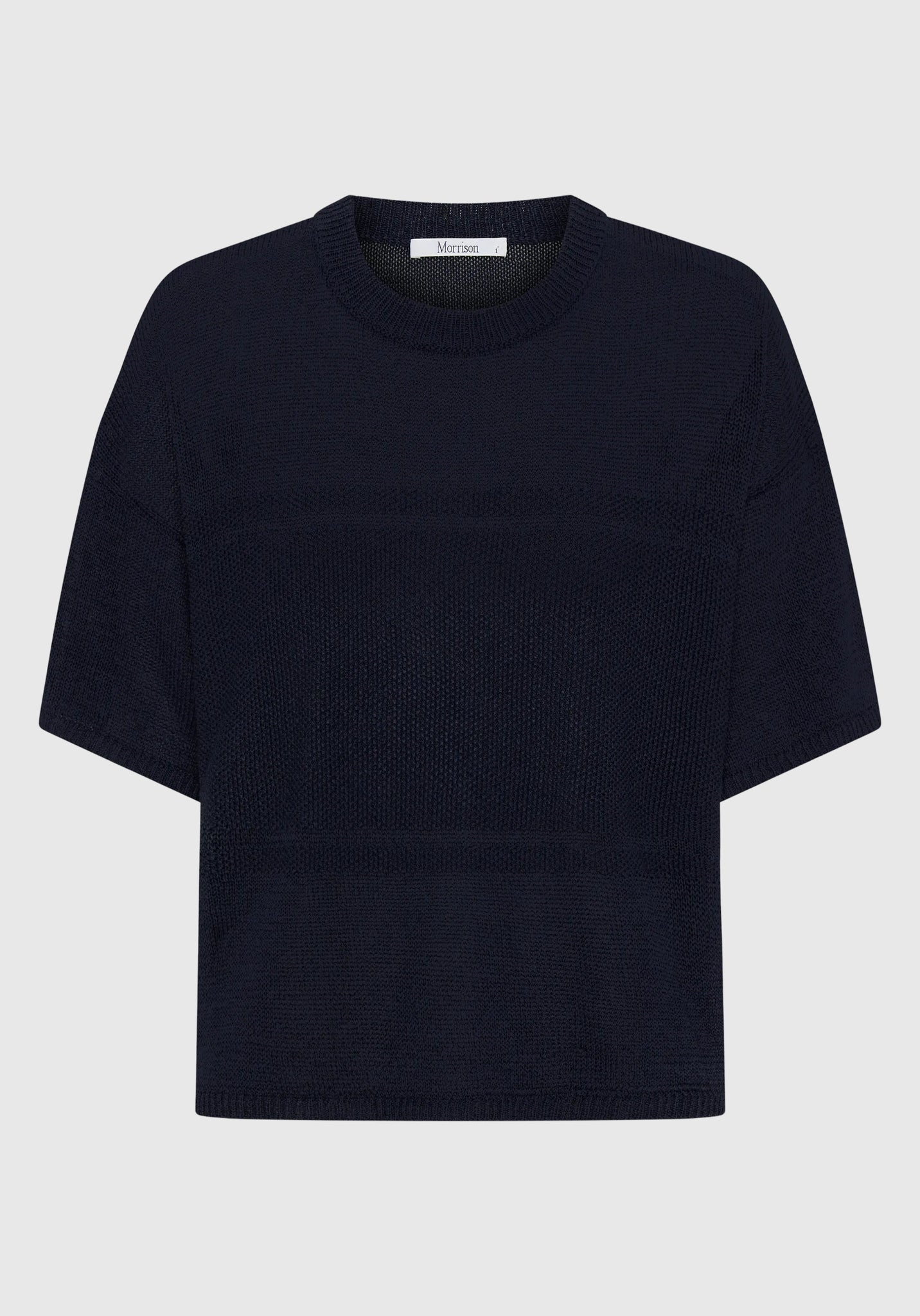 The Marli Knit Tee is made from a soft cotton-paper blend yarn, designed with a classic round neckline and short sleeves. Featuring contrast stitch panels and ribbed trims at the neckline, cuffs, and hem, it offers a modern boxy fit for effortless layering or standalone wear.