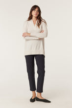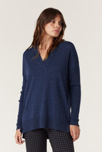 The Sara Merino Jumper features a regular fit in a lightweight knit with a deep ribbed V shawl neckline. It is detailed with dropped shoulders, full-length ribbed sleeves, mock buttons at the cuffs, and a high-low hemline.